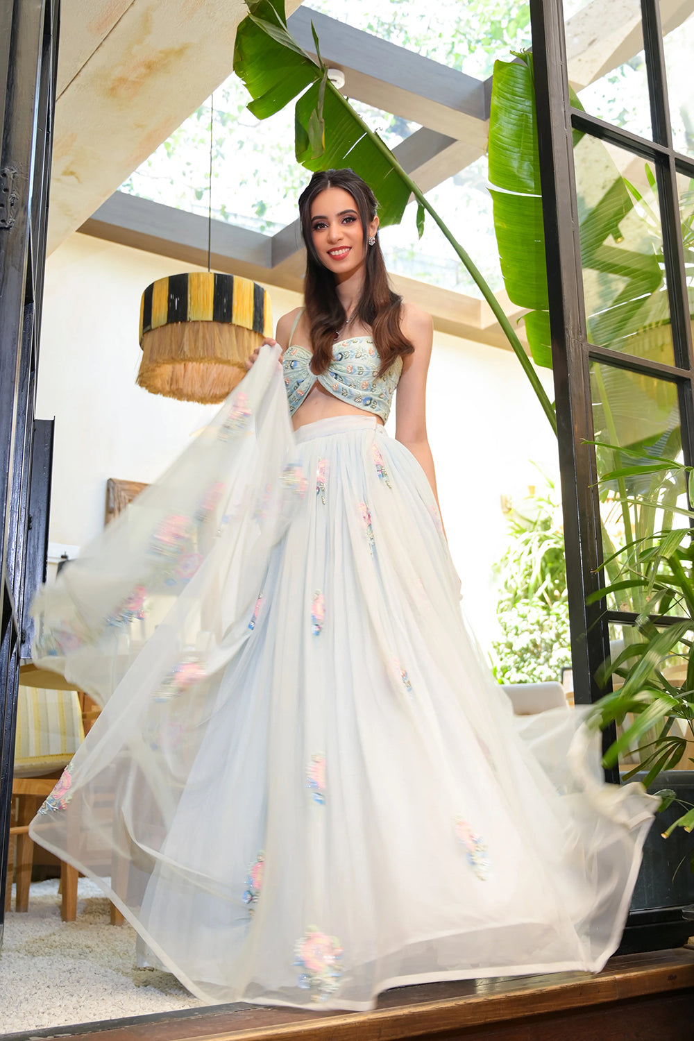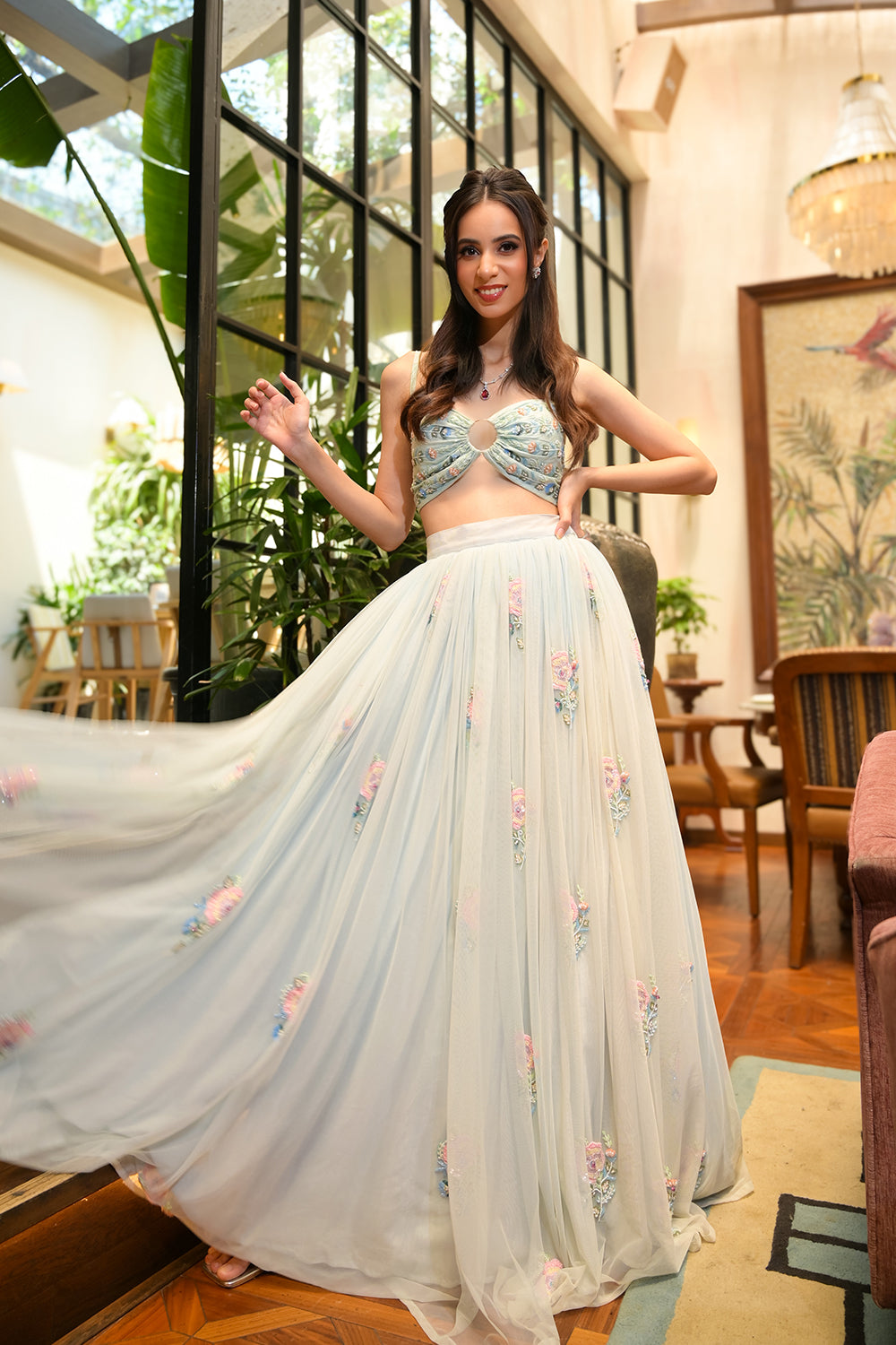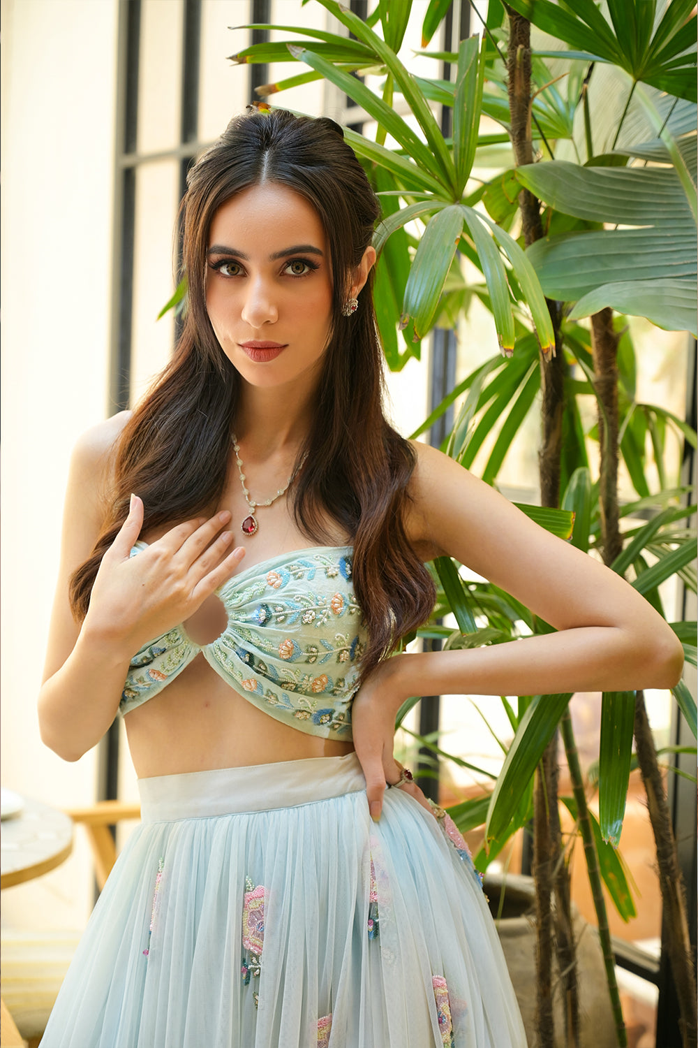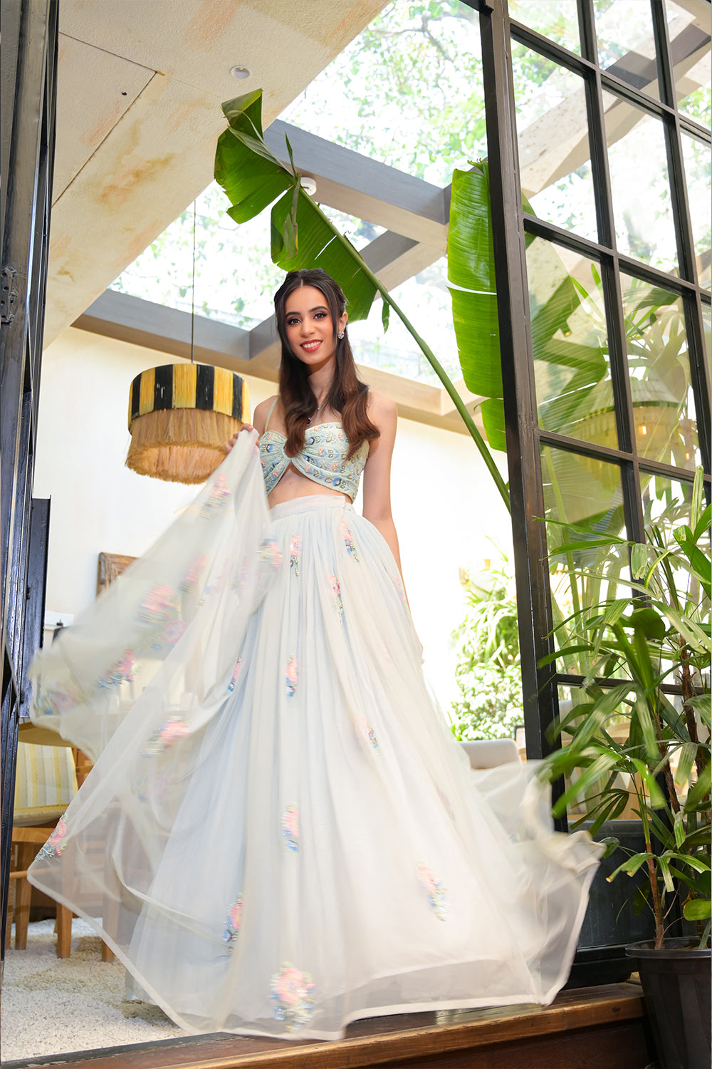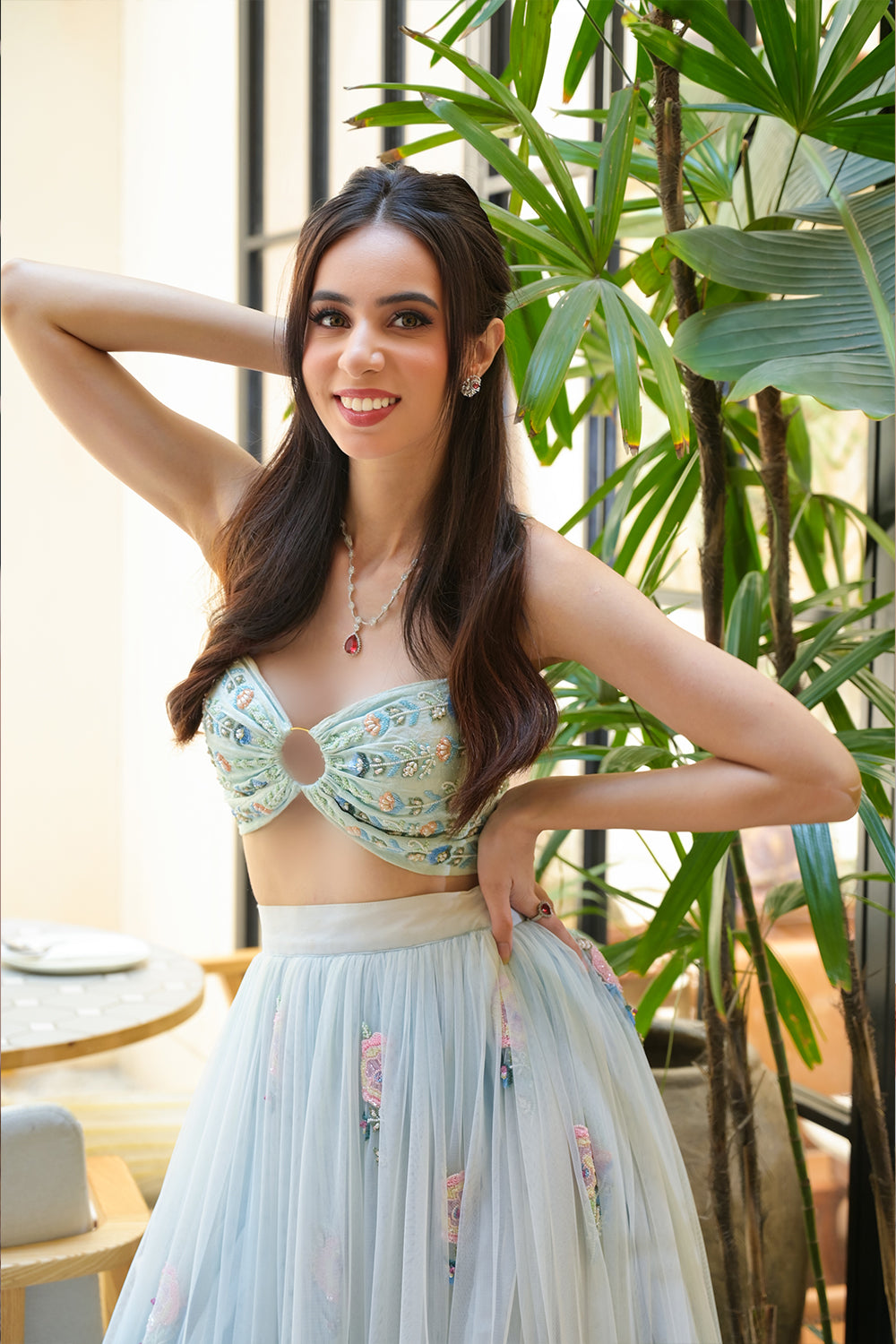 Periwinkle blue raw silk blouse and tulle lehenga with floral motifs in pink.