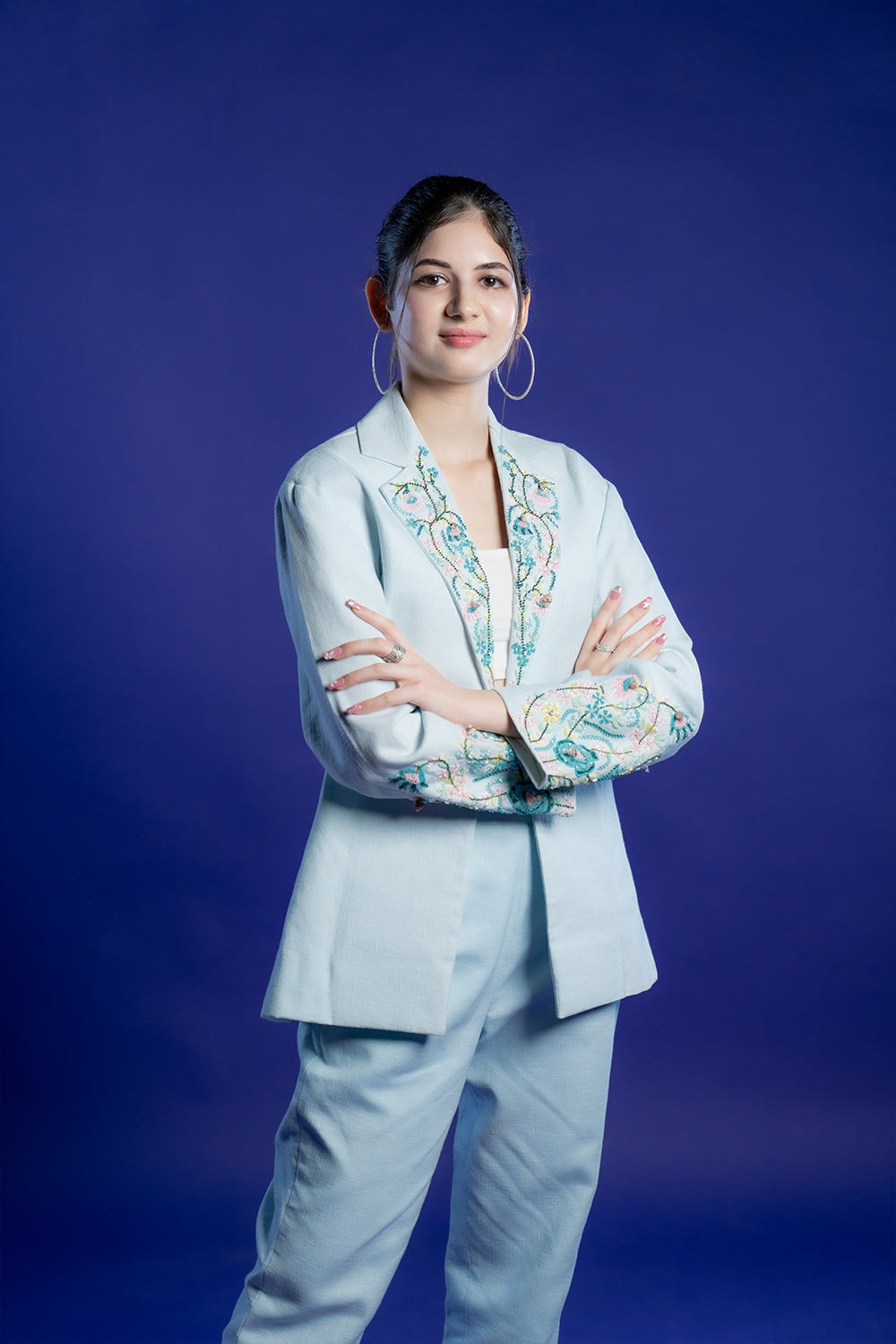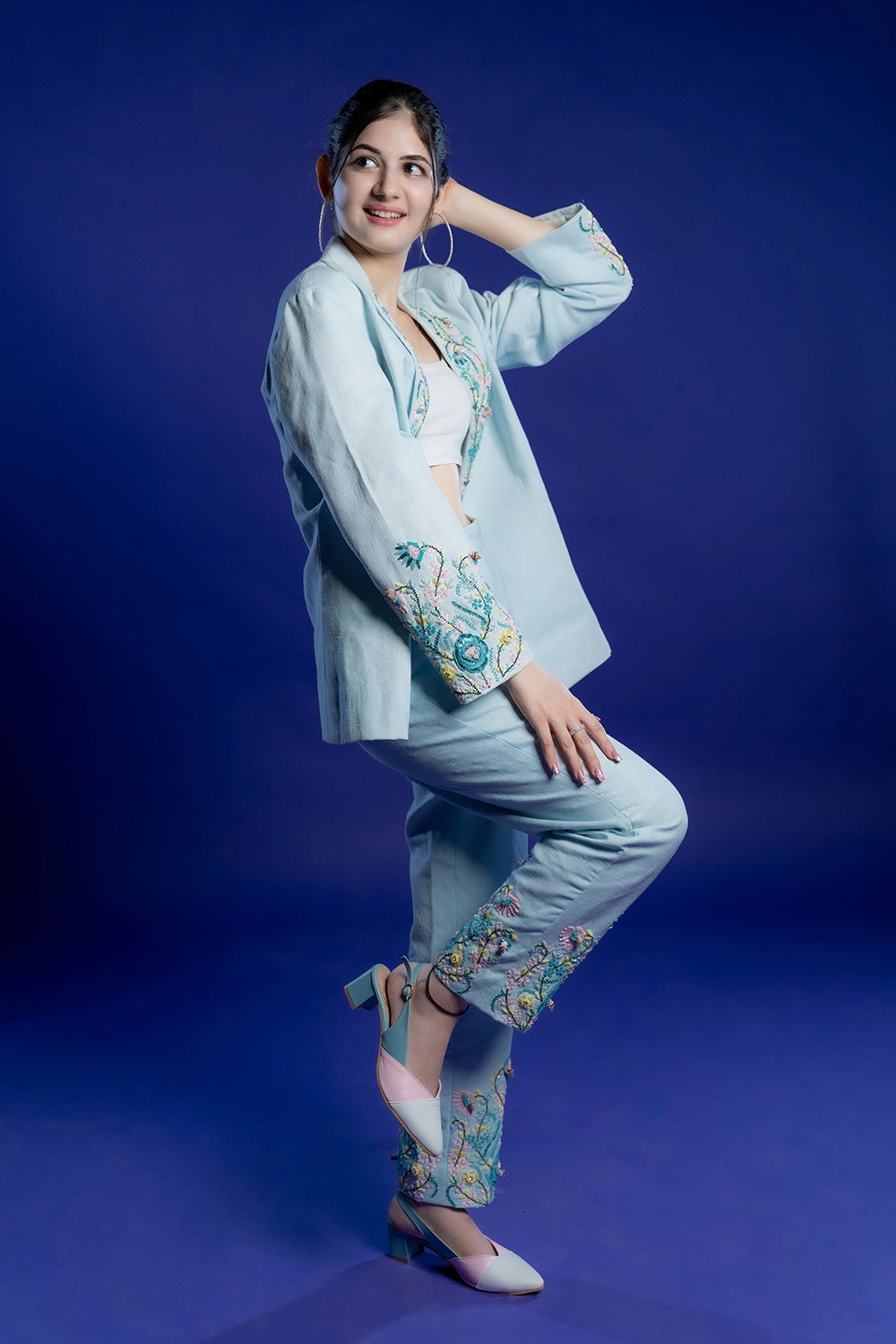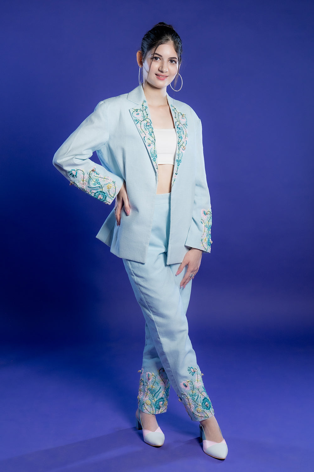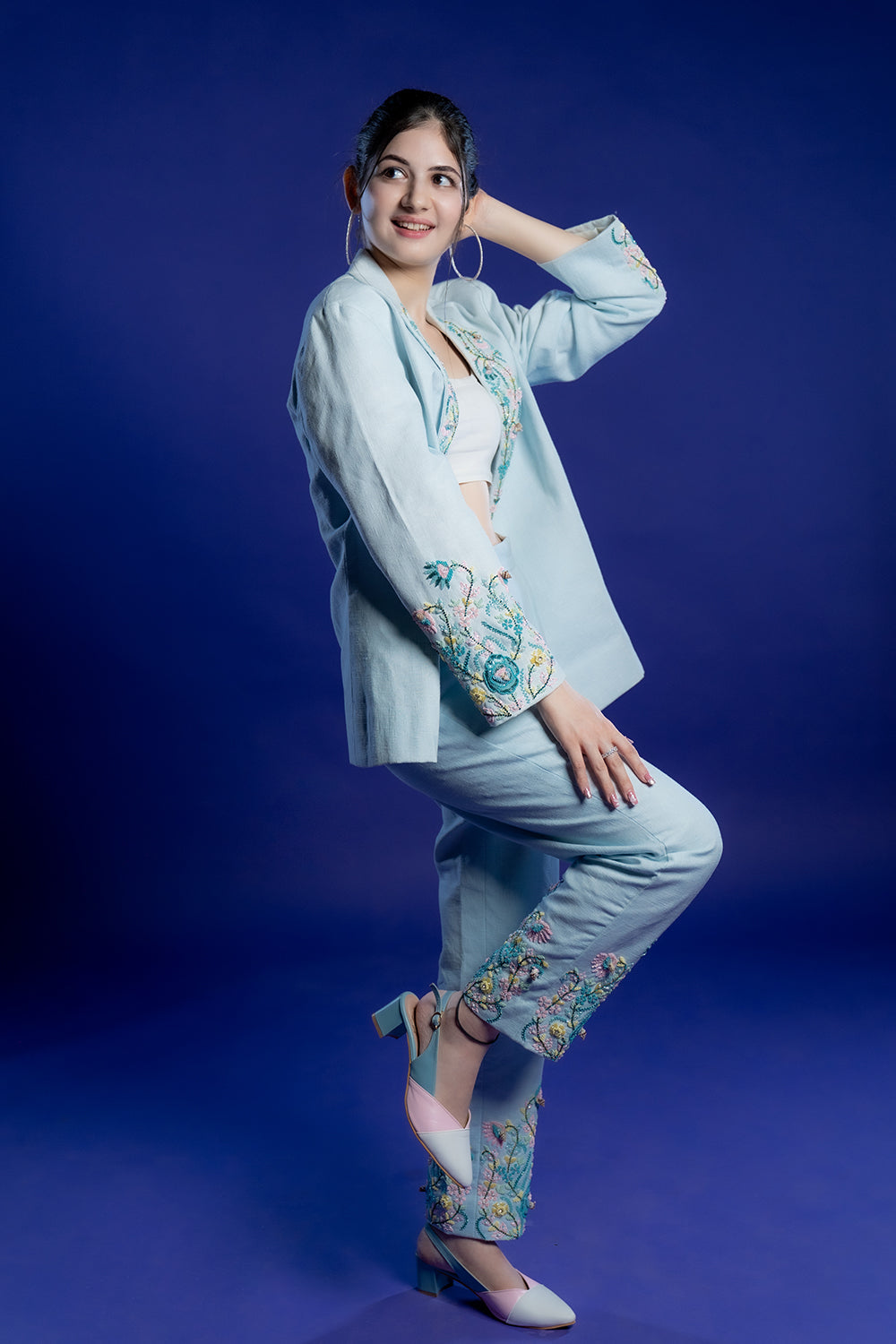 Powder blue co-ord set with floral embroidery on the collar, sleeves and pants.
