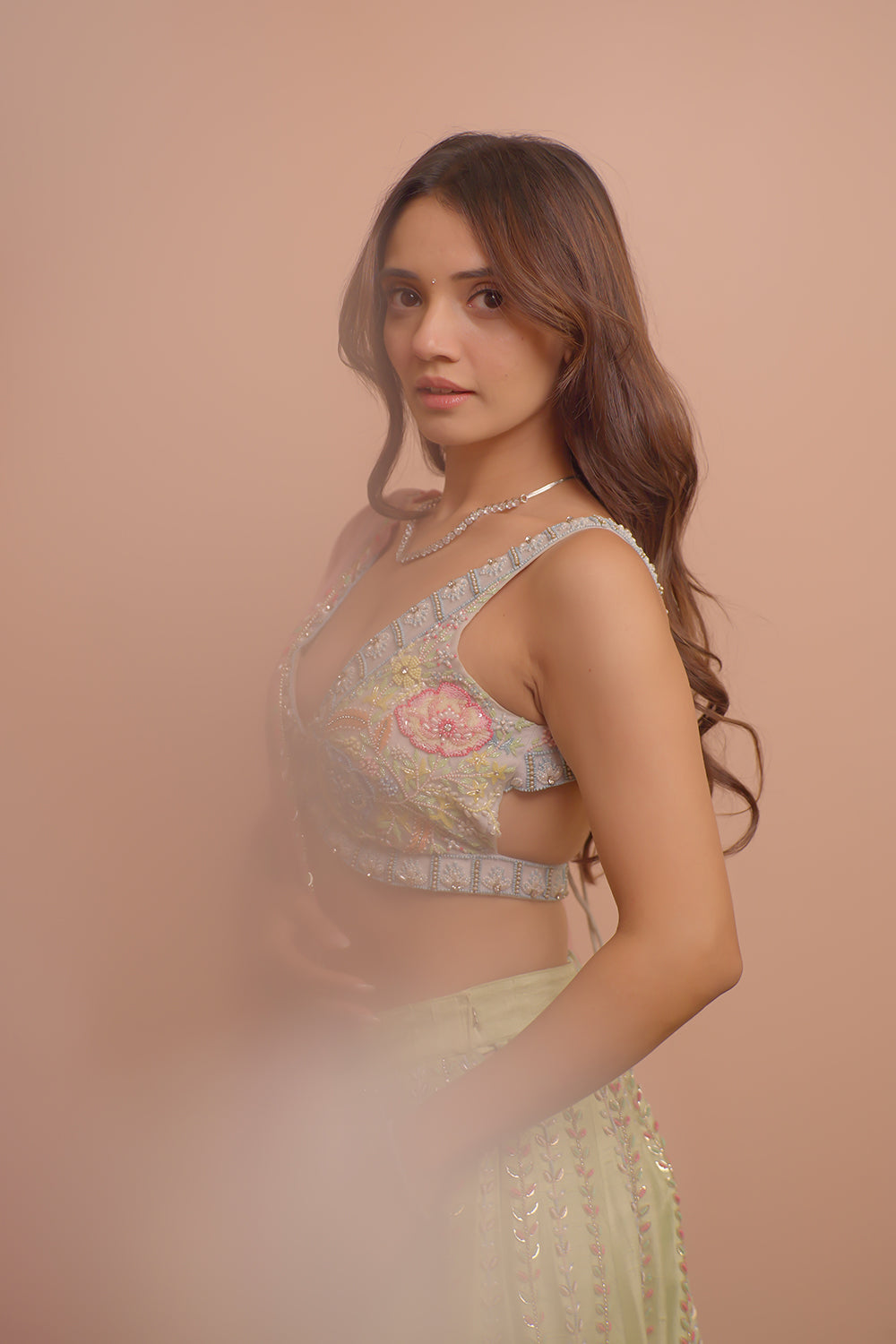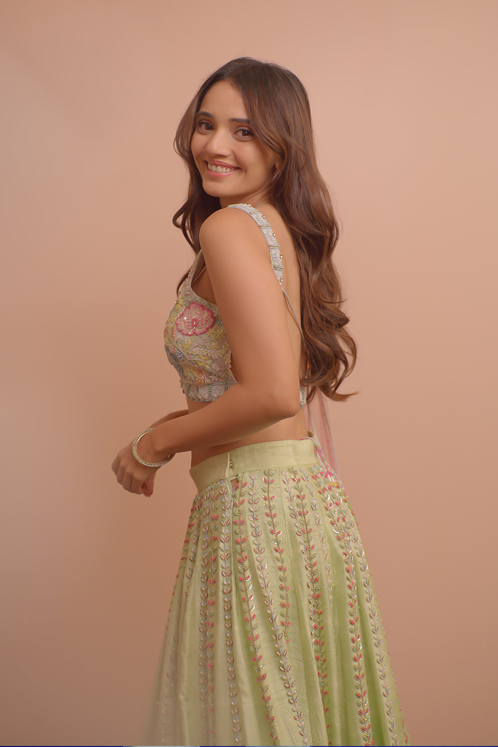 Mint green raw silk lehenga embellished with sequins and pearls along with ice blue blouse and periwinkle pink tulle dupatta with floral details.