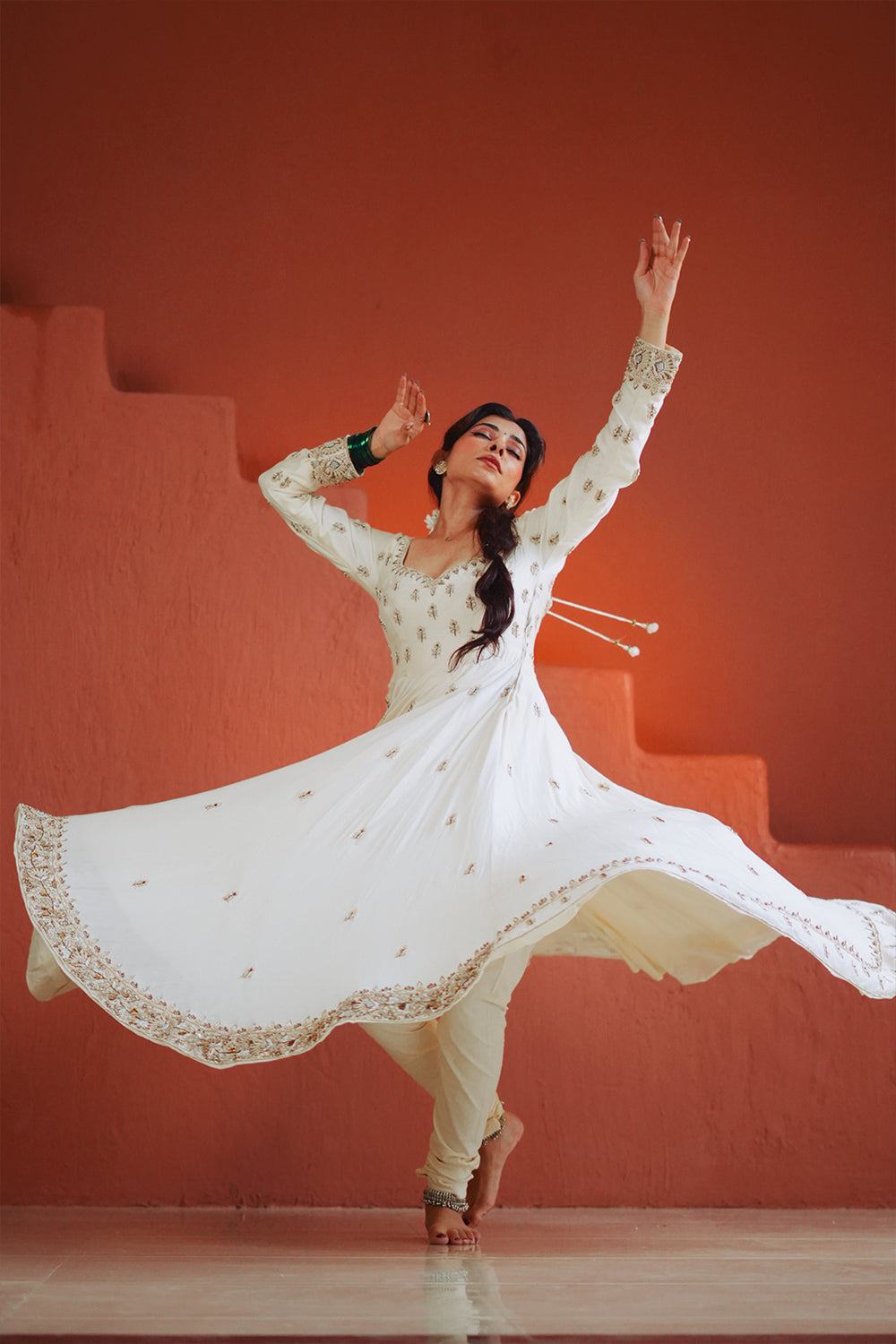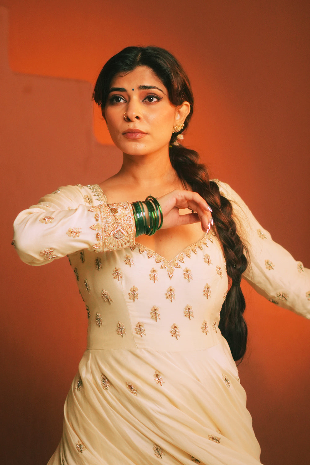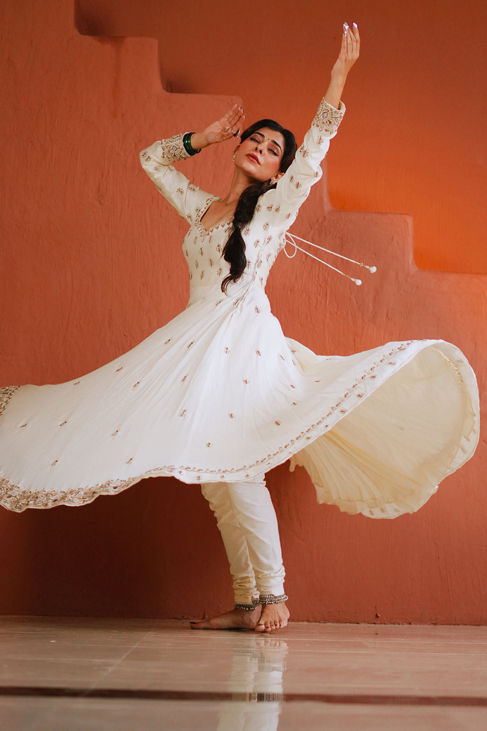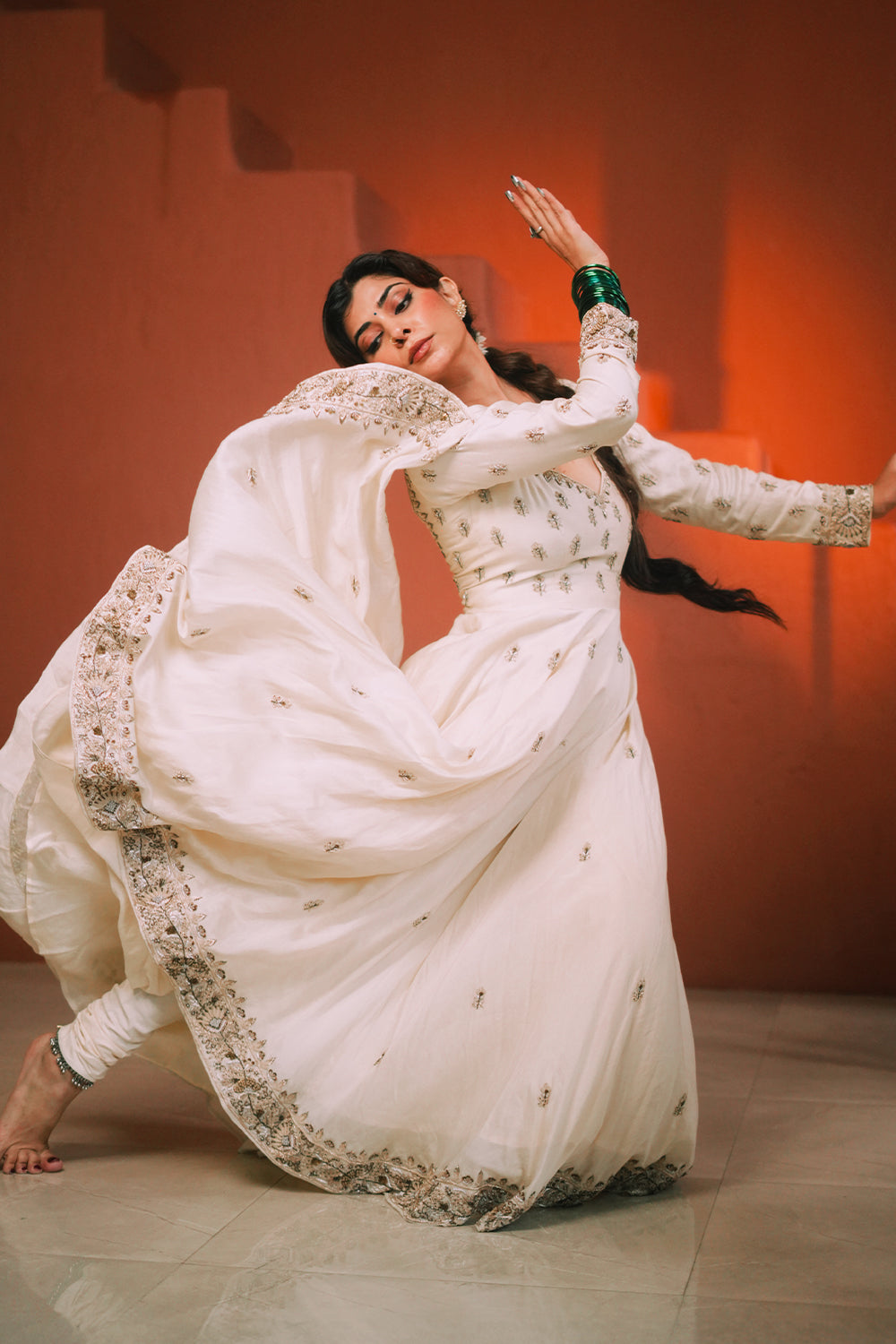 A vision in Chanderi, this flowing Anarkali, accented with delicate motifs, is paired with choodidar pants and a graceful, ornamented dupatta. A soothing blend of tradition and simplicity.