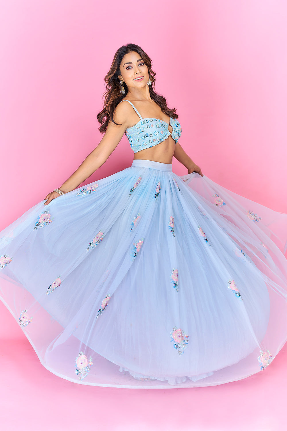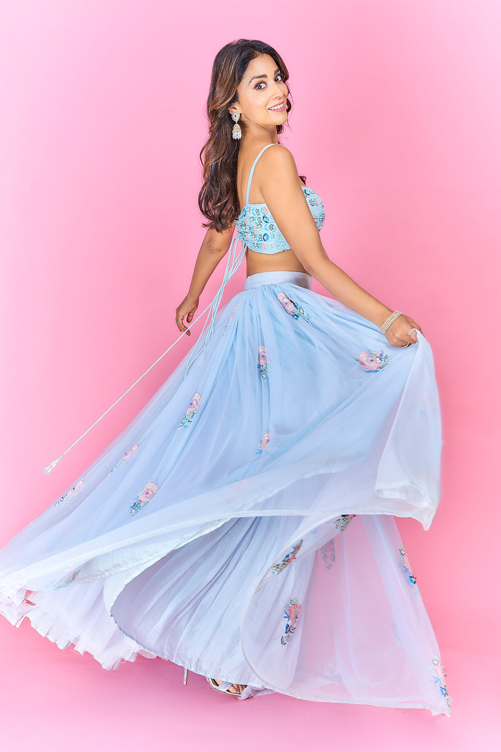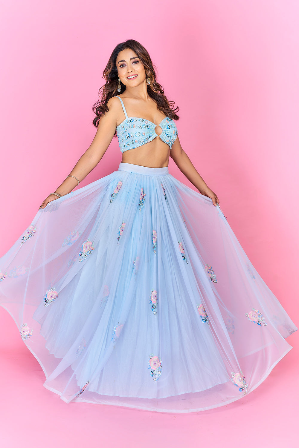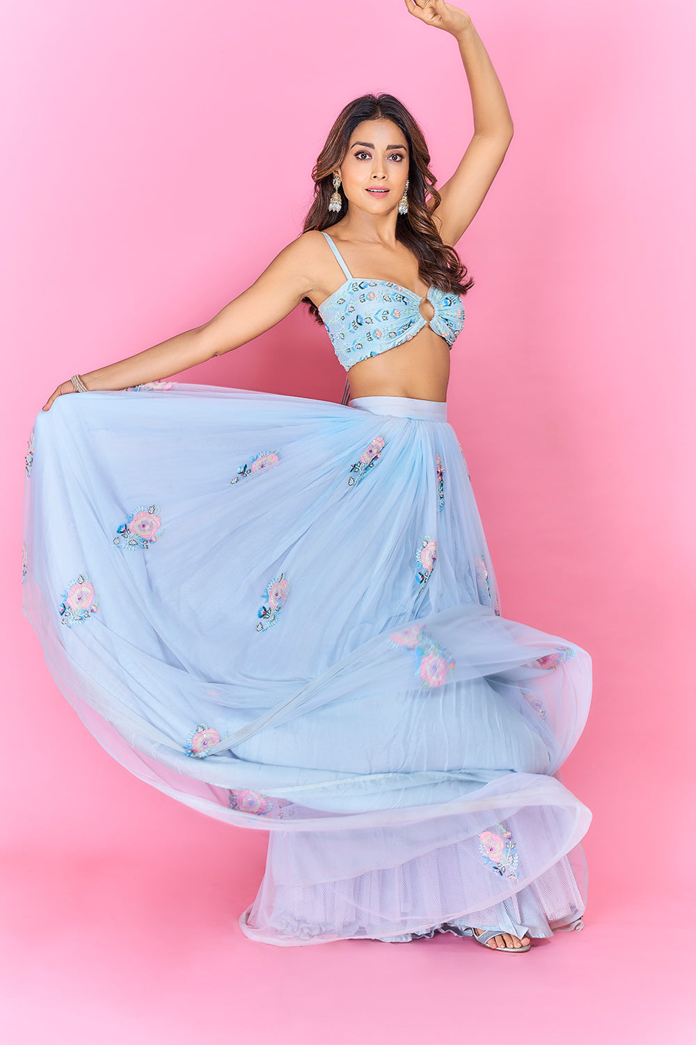 Periwinkle blue raw silk blouse and tulle lehenga with floral motifs in pink.