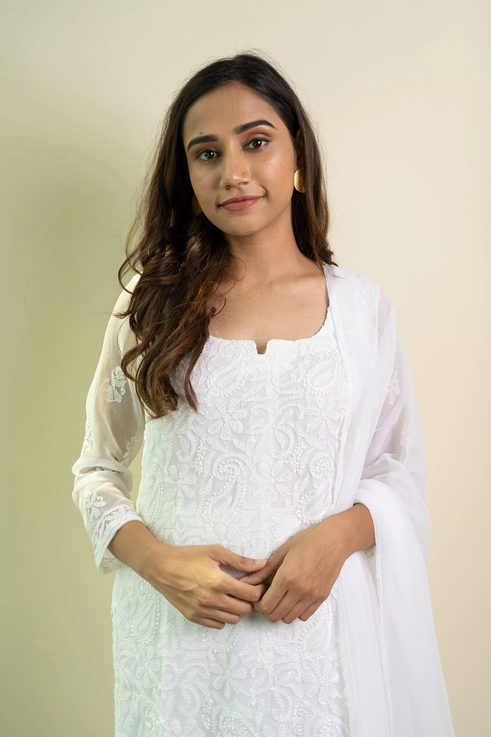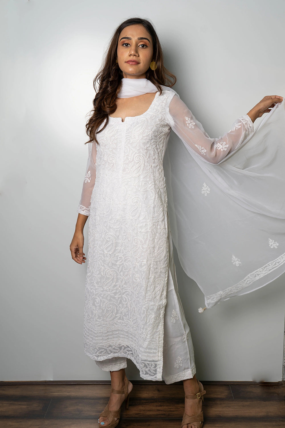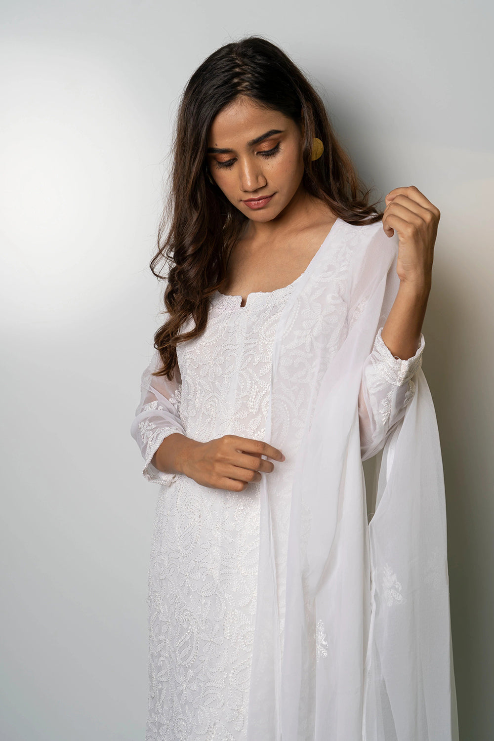 A classic three piece white Chikankari suit set, consists of a long kurta, pants and sheer dupatta. The kurta and pants have chikan work throughout and are paired beautifully with a sheer dupatta - embroidered with resham thread.