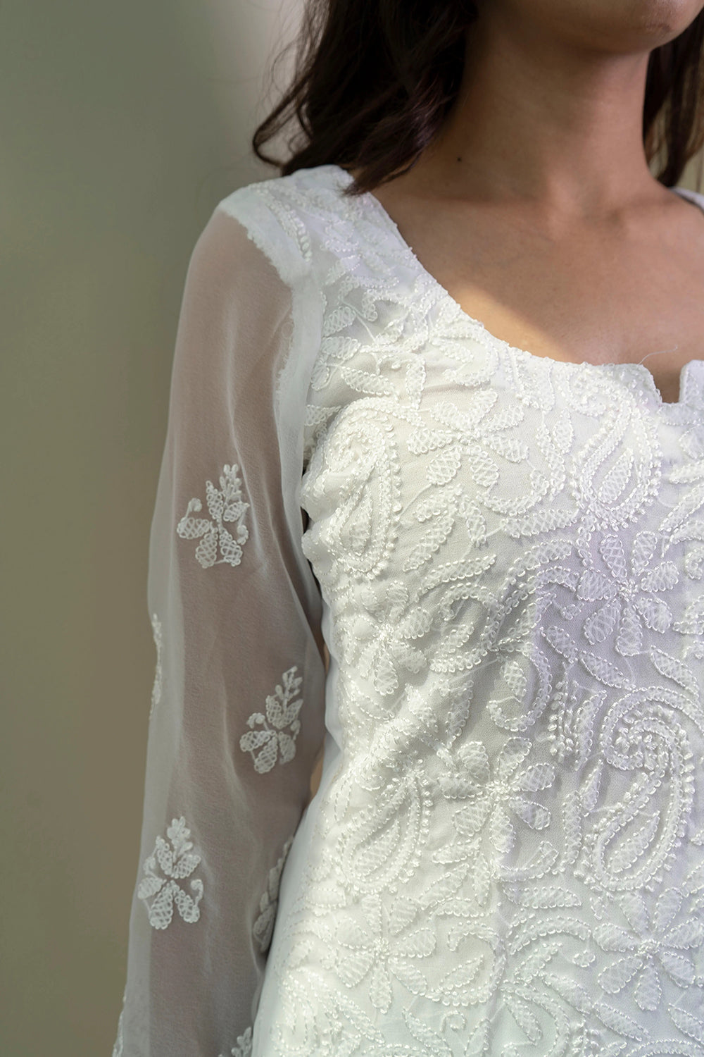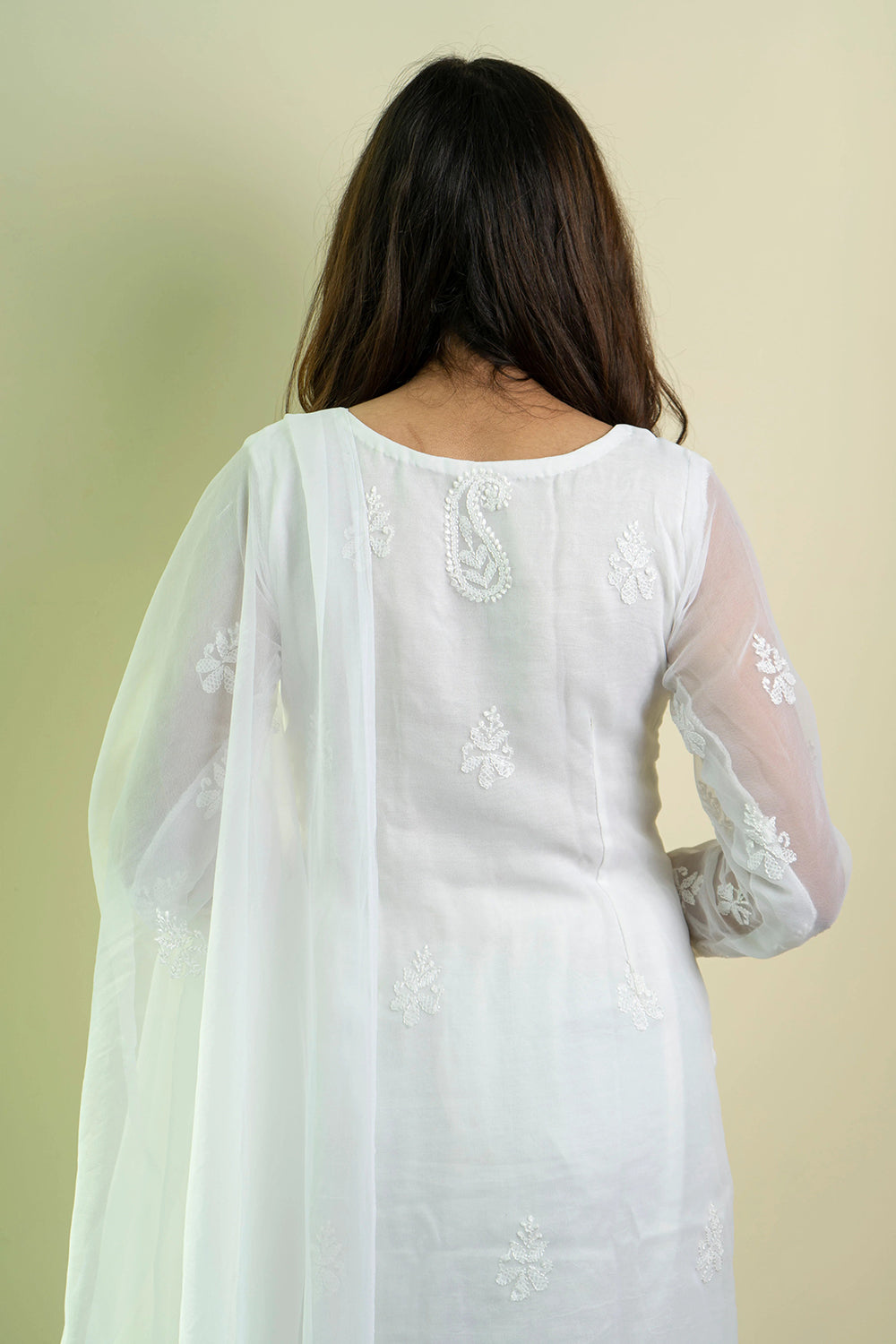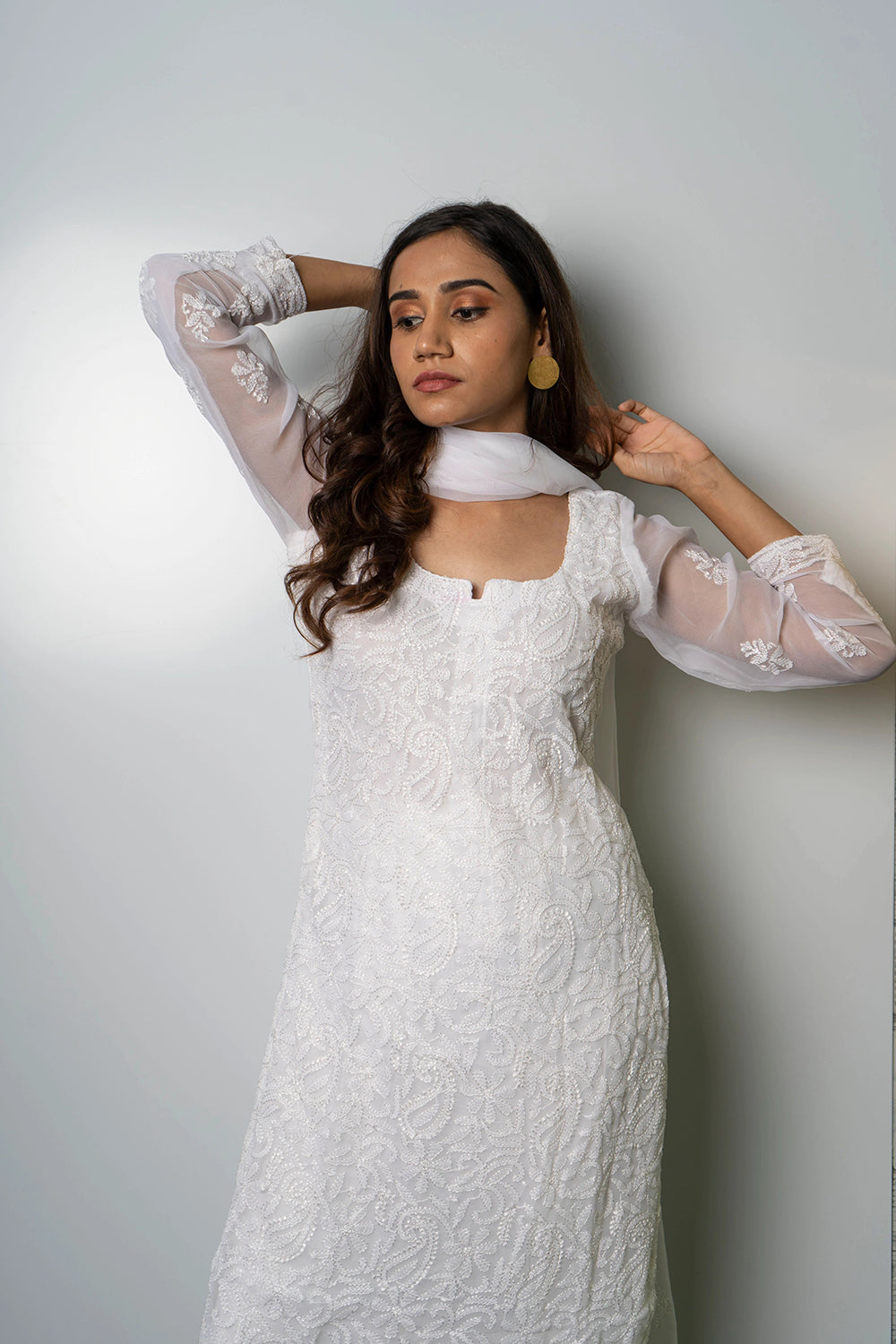 A classic three piece white Chikankari suit set, consists of a long kurta, pants and sheer dupatta. The kurta and pants have chikan work throughout and are paired beautifully with a sheer dupatta - embroidered with resham thread.