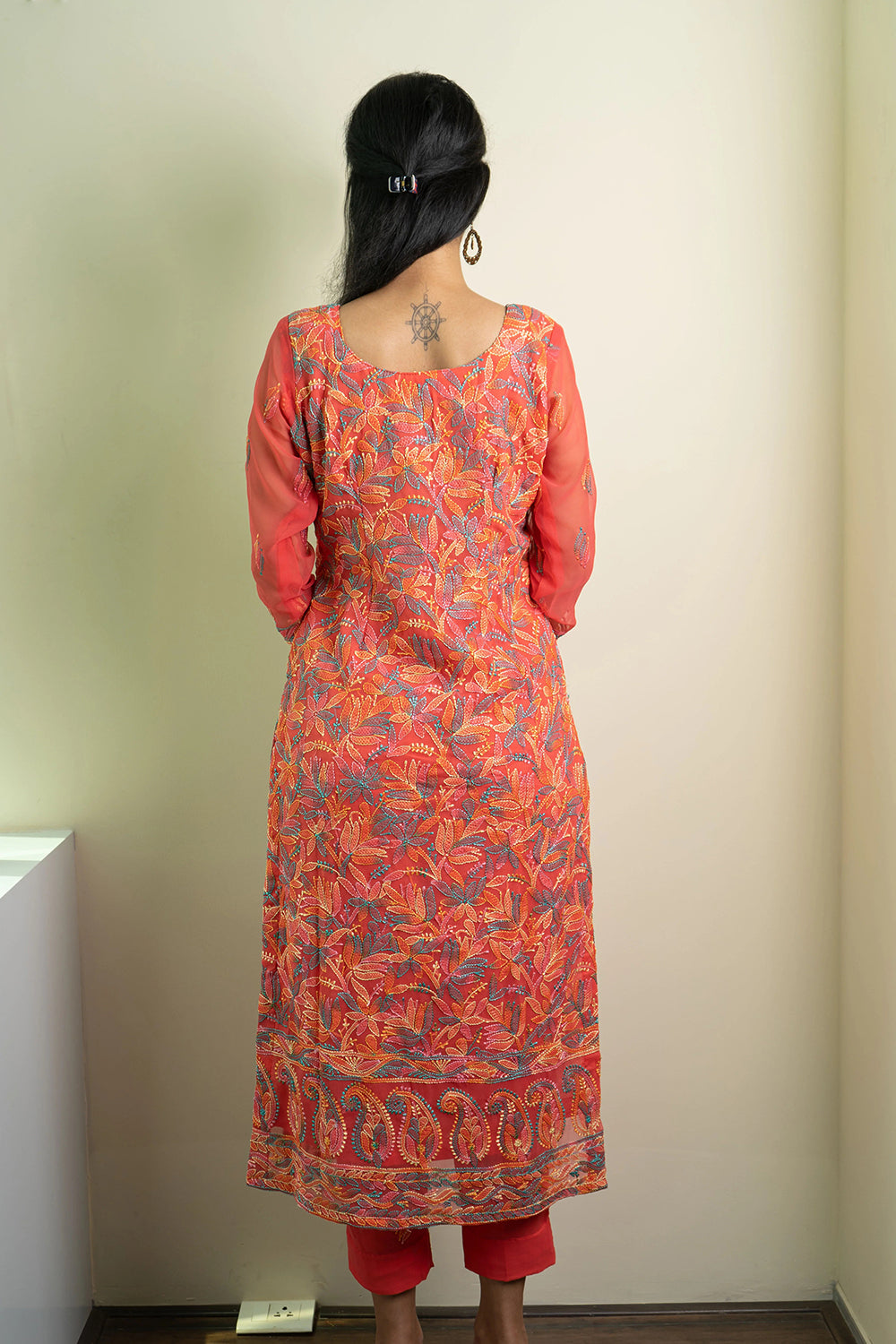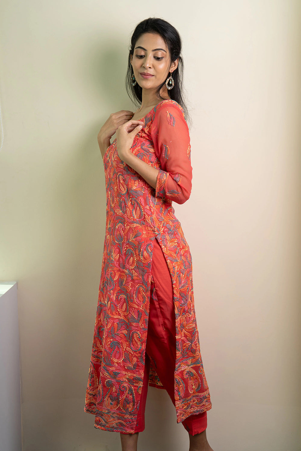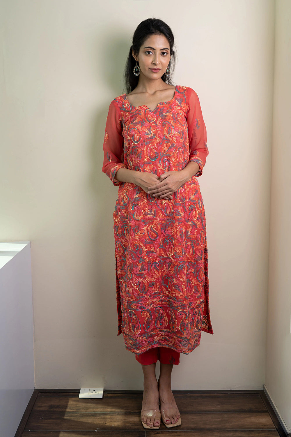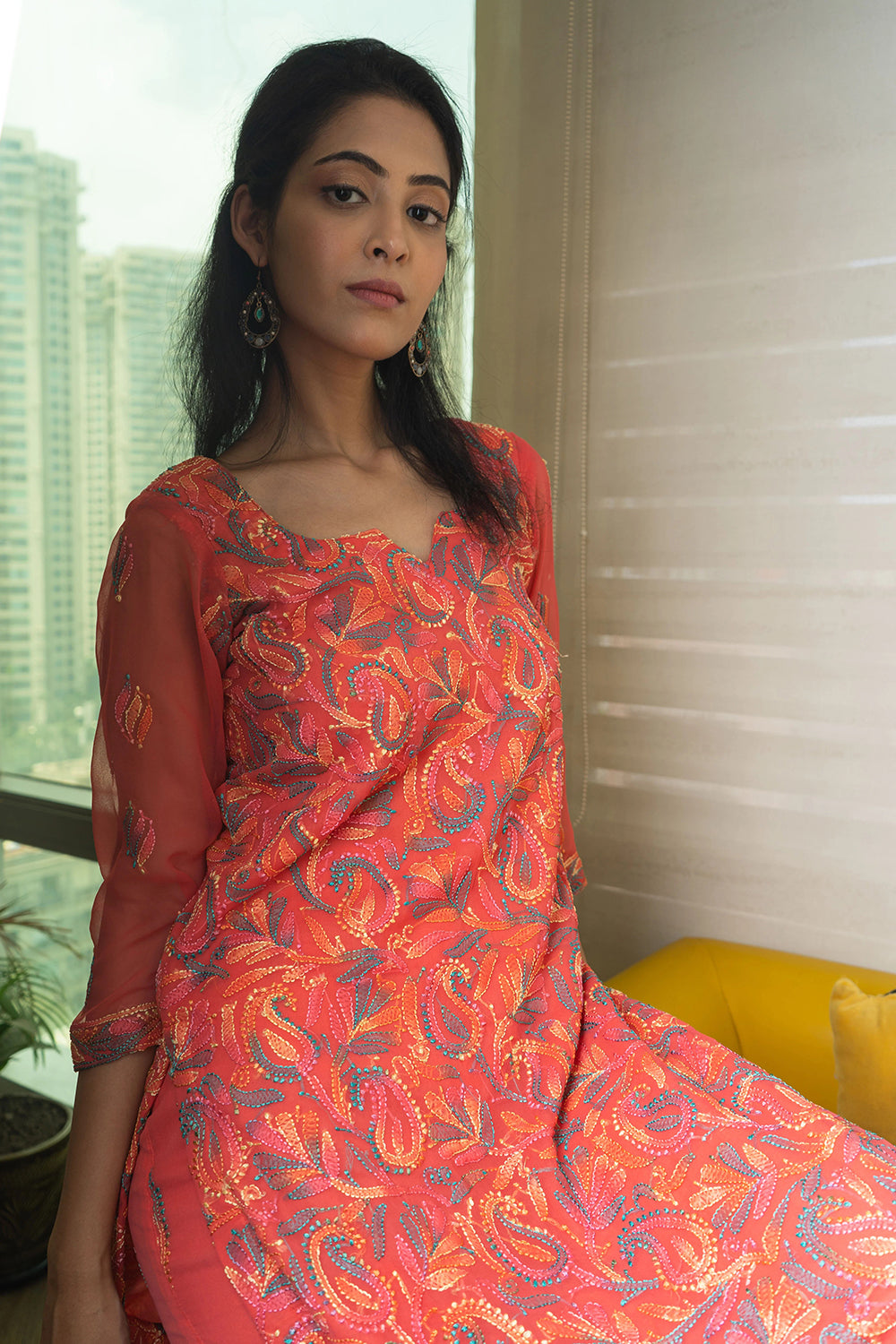 Chikankari embroidered rustic shade kurta - with three quarter sheer sleeves with work at the end of sleeve and in patches through out. Paired with same rustic red shade pants to complete the look.