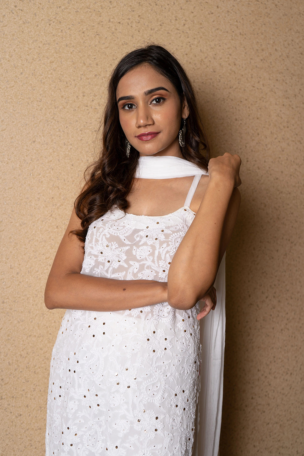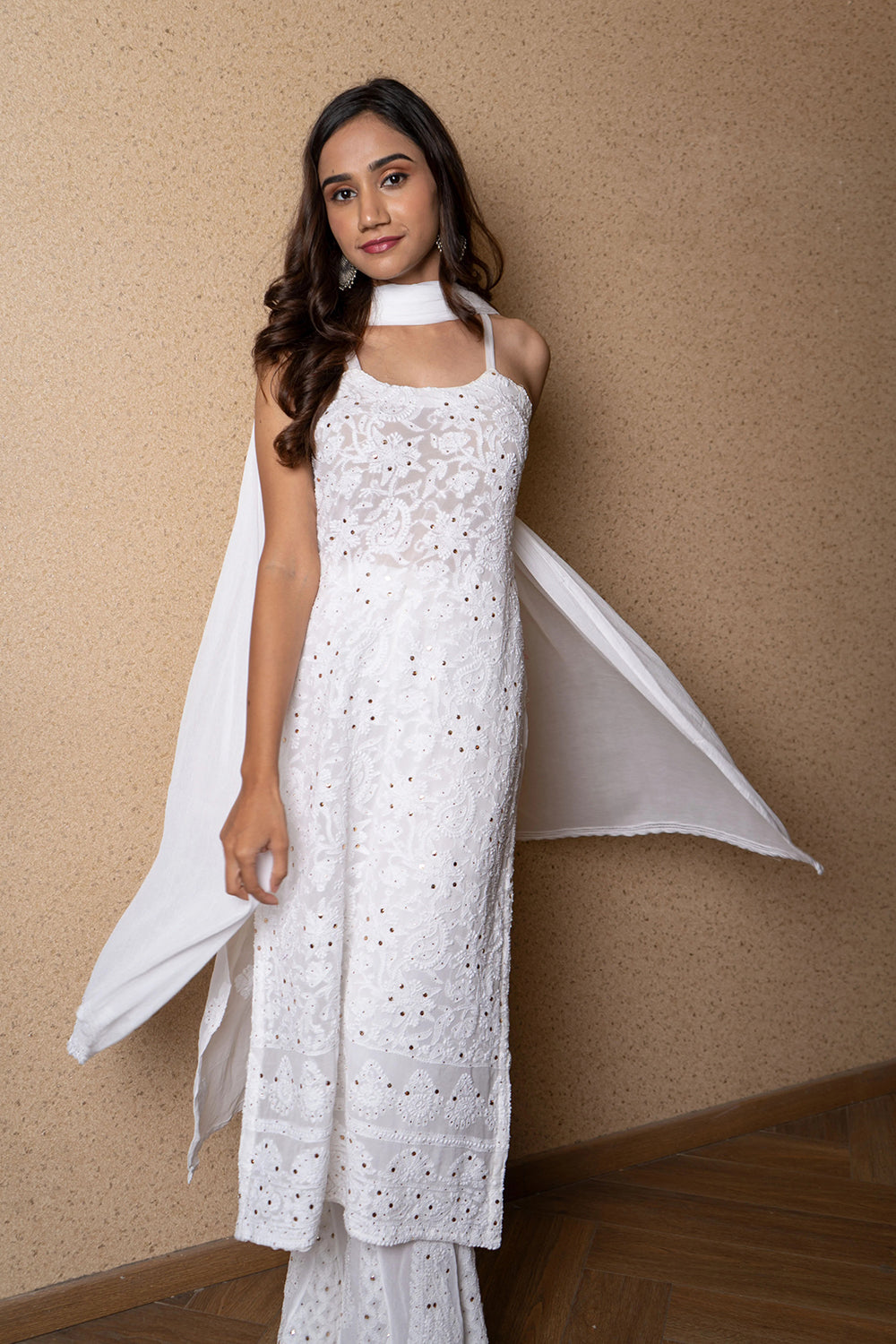 Strappy white Chikankari and Kaamdani kurta with floral detailing paired with sharara of the same work and colour - thoughtfully paired with a white sheer dupatta.