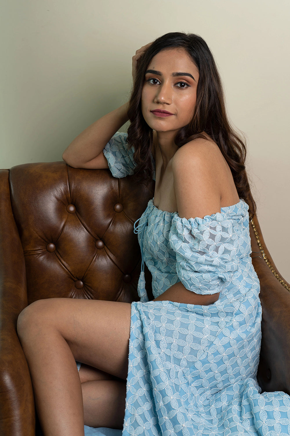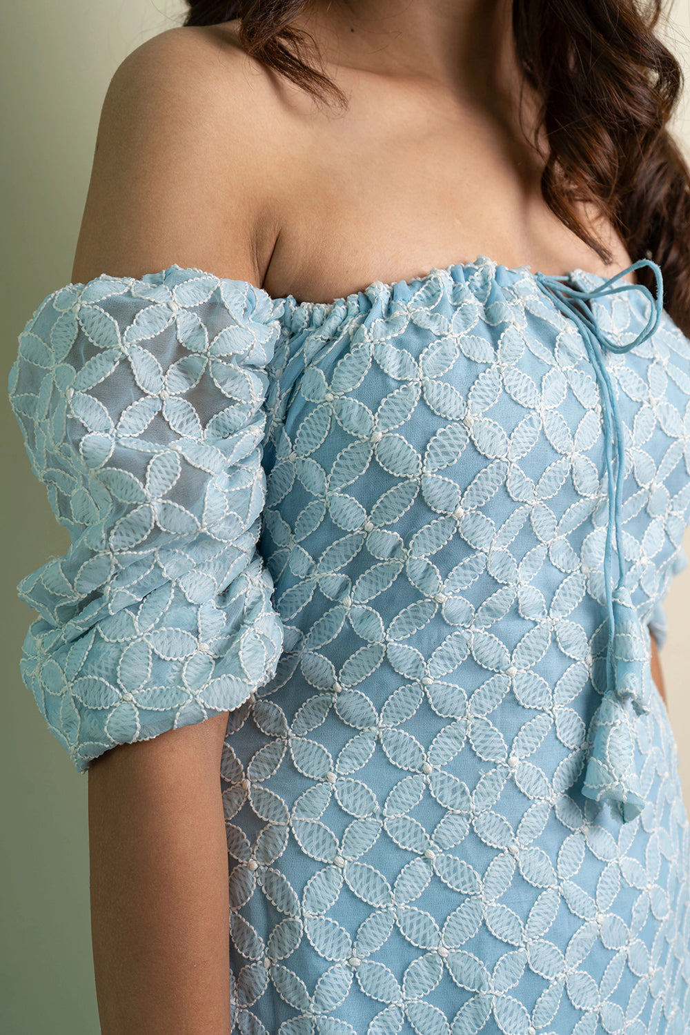 Featuring this gorgeous aqua blue ethnic dress - off the shoulder with geometrically patterned Chikankari embroidery. The dress has a slightly above the knee slit, a dori attached to the neckline and puffy sleeves to bring the whole piece together.