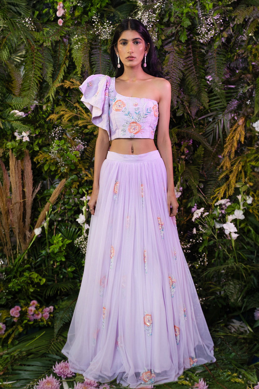Lavender raw silk one sided off shoulder blouse and tulle lehenga with floral motifs in peach.