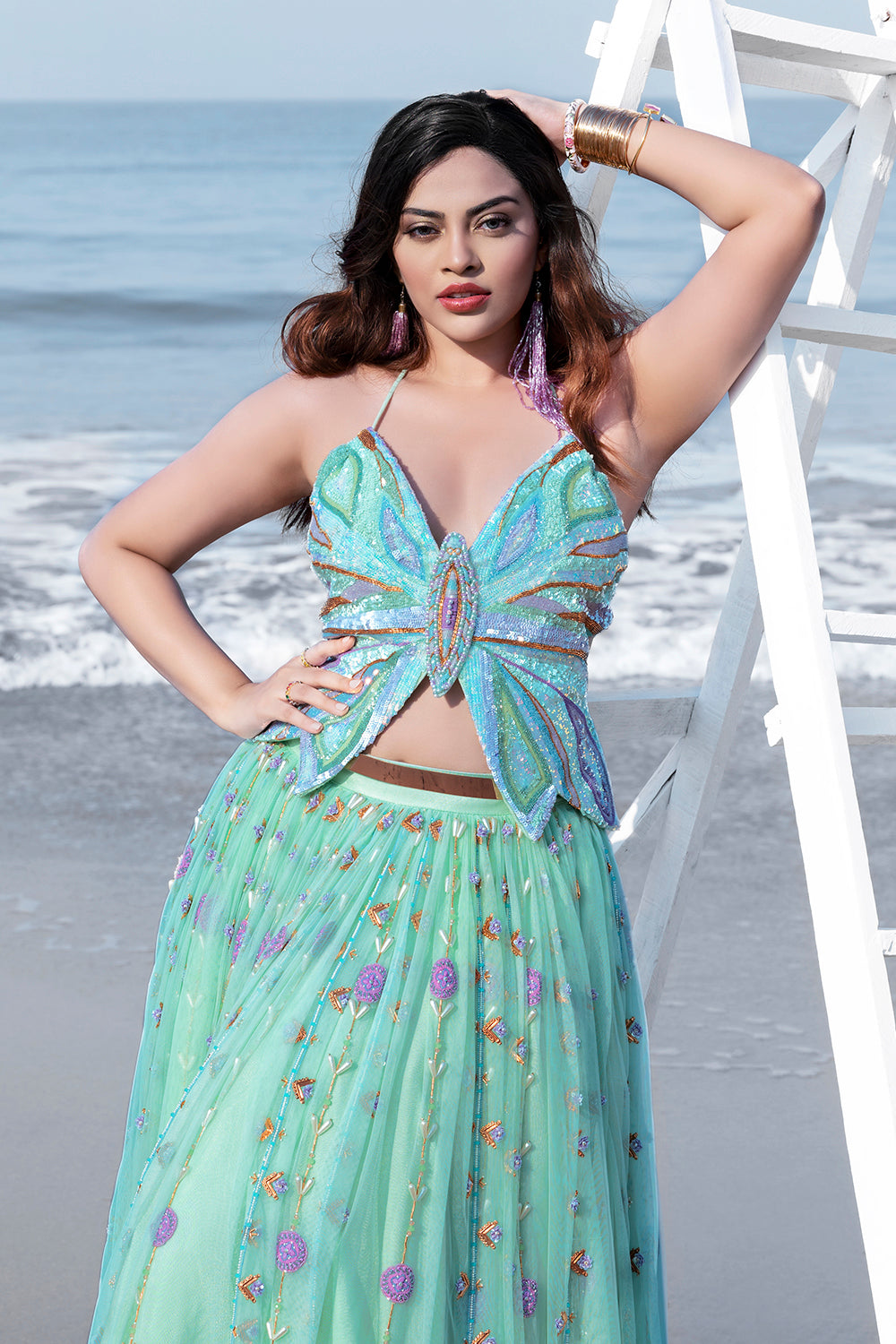 The blouse is adorned with shimmering sequins, glass-cut beads, and dainty pearls, adding a touch of glamour to the overall ensemble.