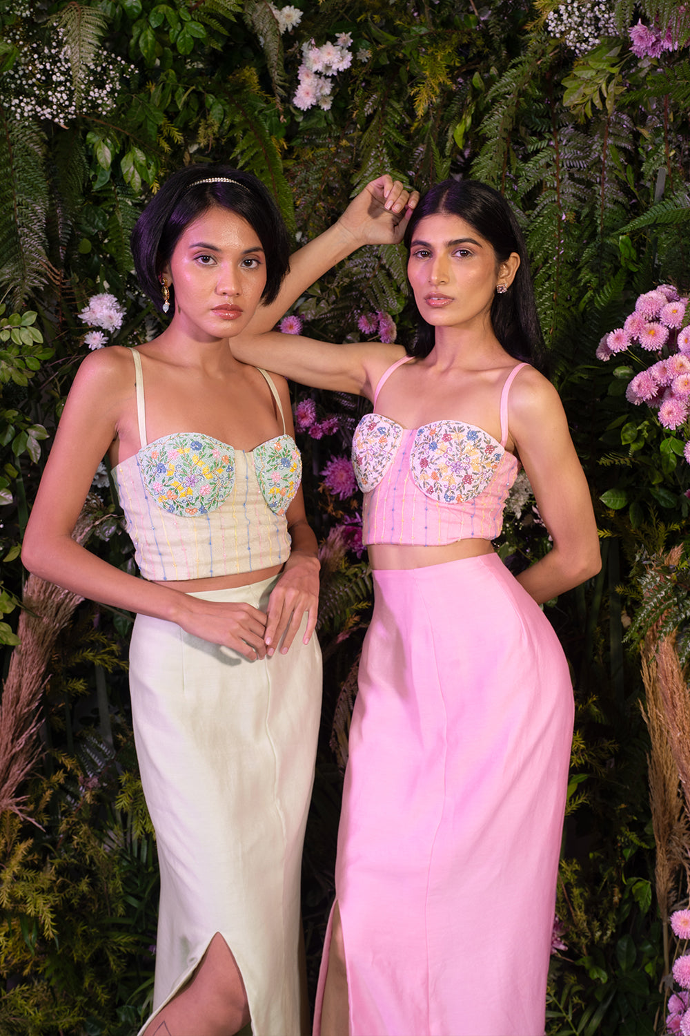 Pink tube top with floral embroidery and fitted slit skirt in Chanderi fabric.