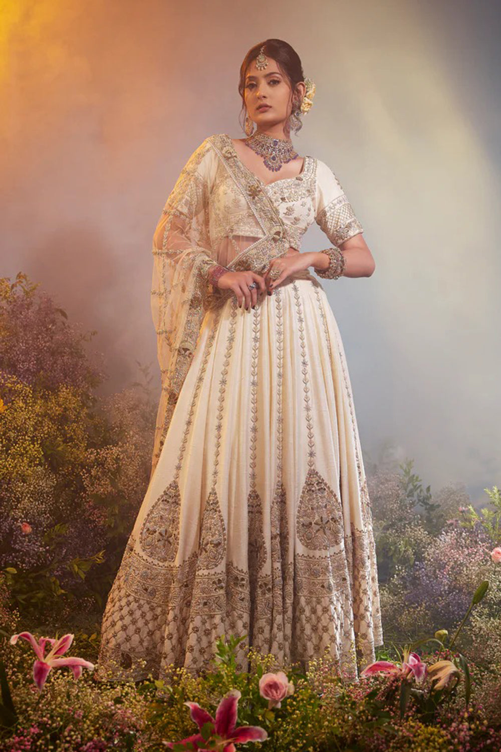 A breathtaking masterpiece, this raw silk bridal lehenga adorned with heavy border of intricate zari embroidery along with huge motifs to elevate the look is paired with a heavily embellished net dupatta with scallops and handmade latkans and a half-sleeved fully embroidered blouse making it a one of a kind. This royal ensemble is a dream come true for the bride-to-be.
