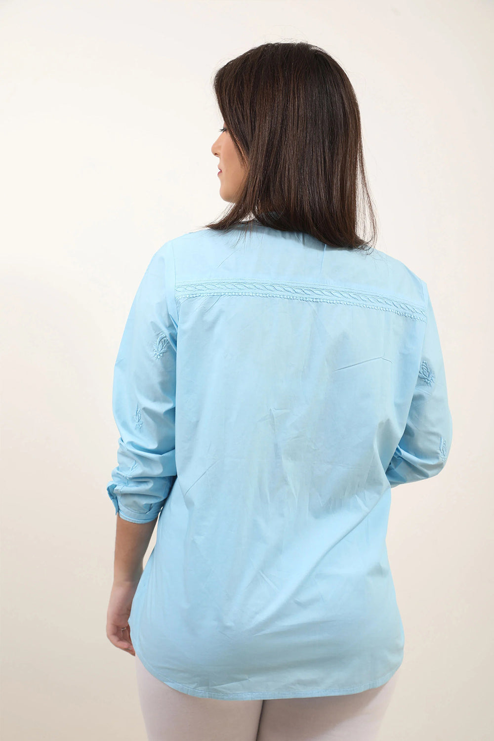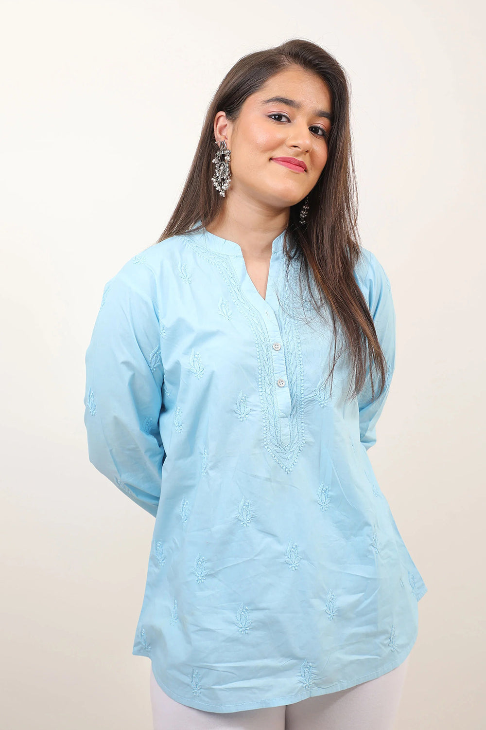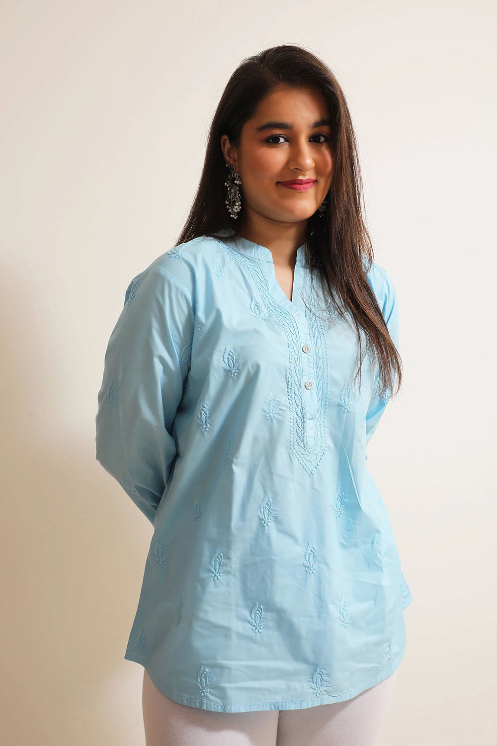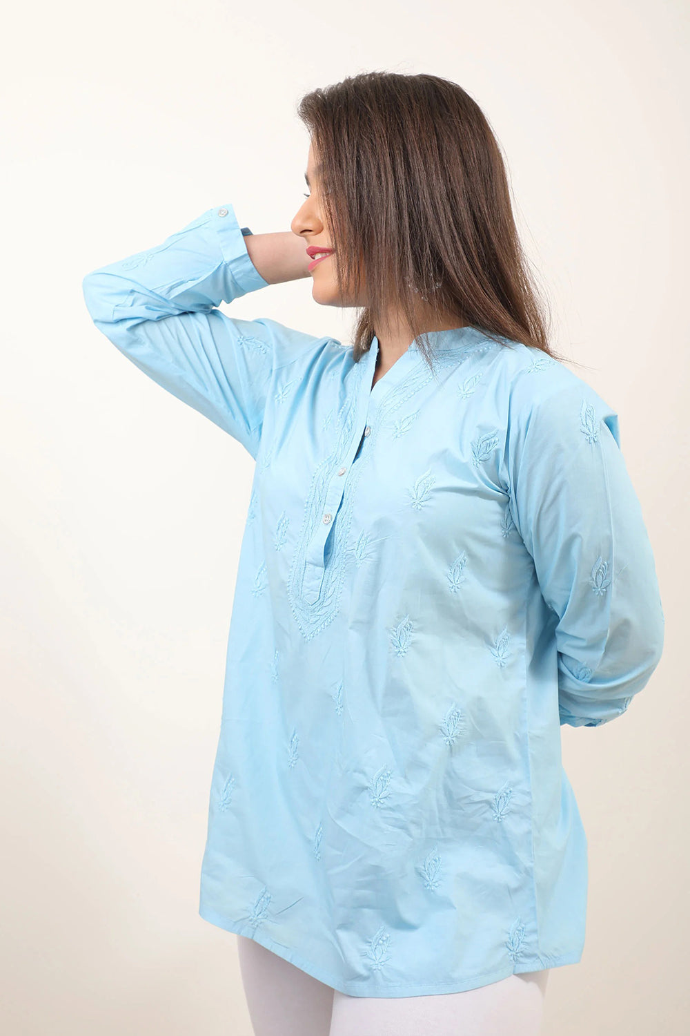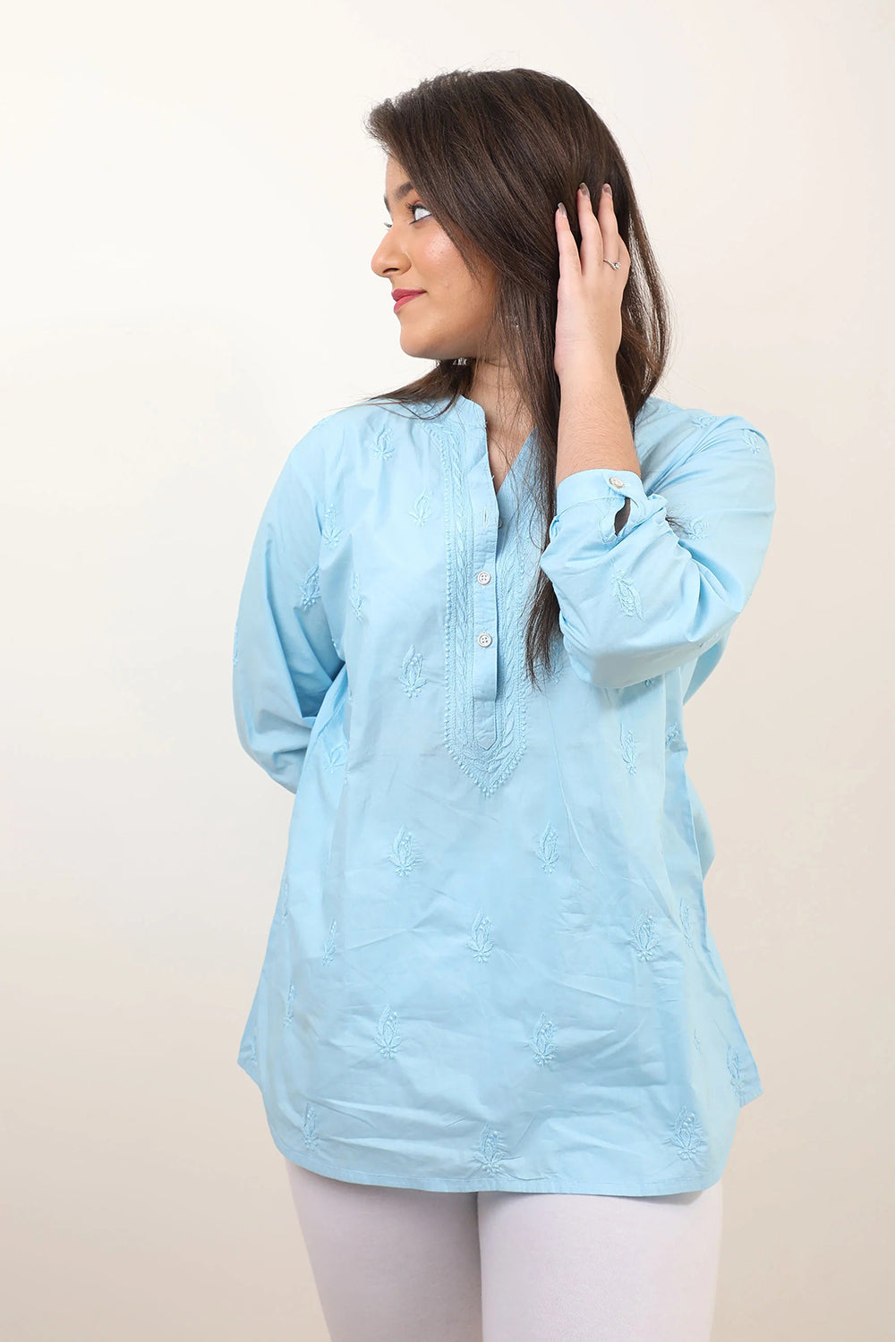The most elegant colour scheme is one in pastels. Featuring our pastel dream - a short kurti in a beachy light blue colour with impeccable Chikankari work, Mandarin collar and statement button detailing.