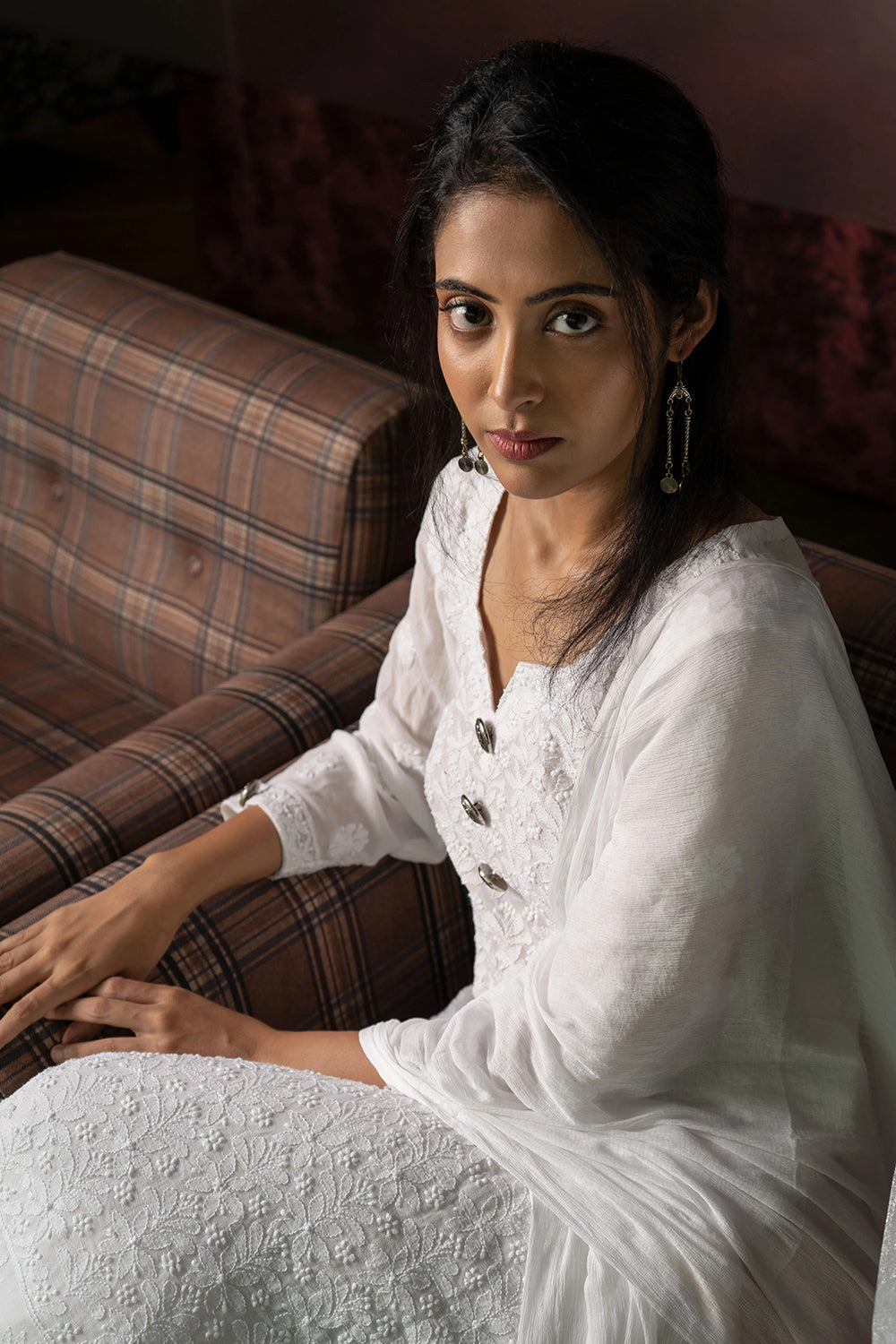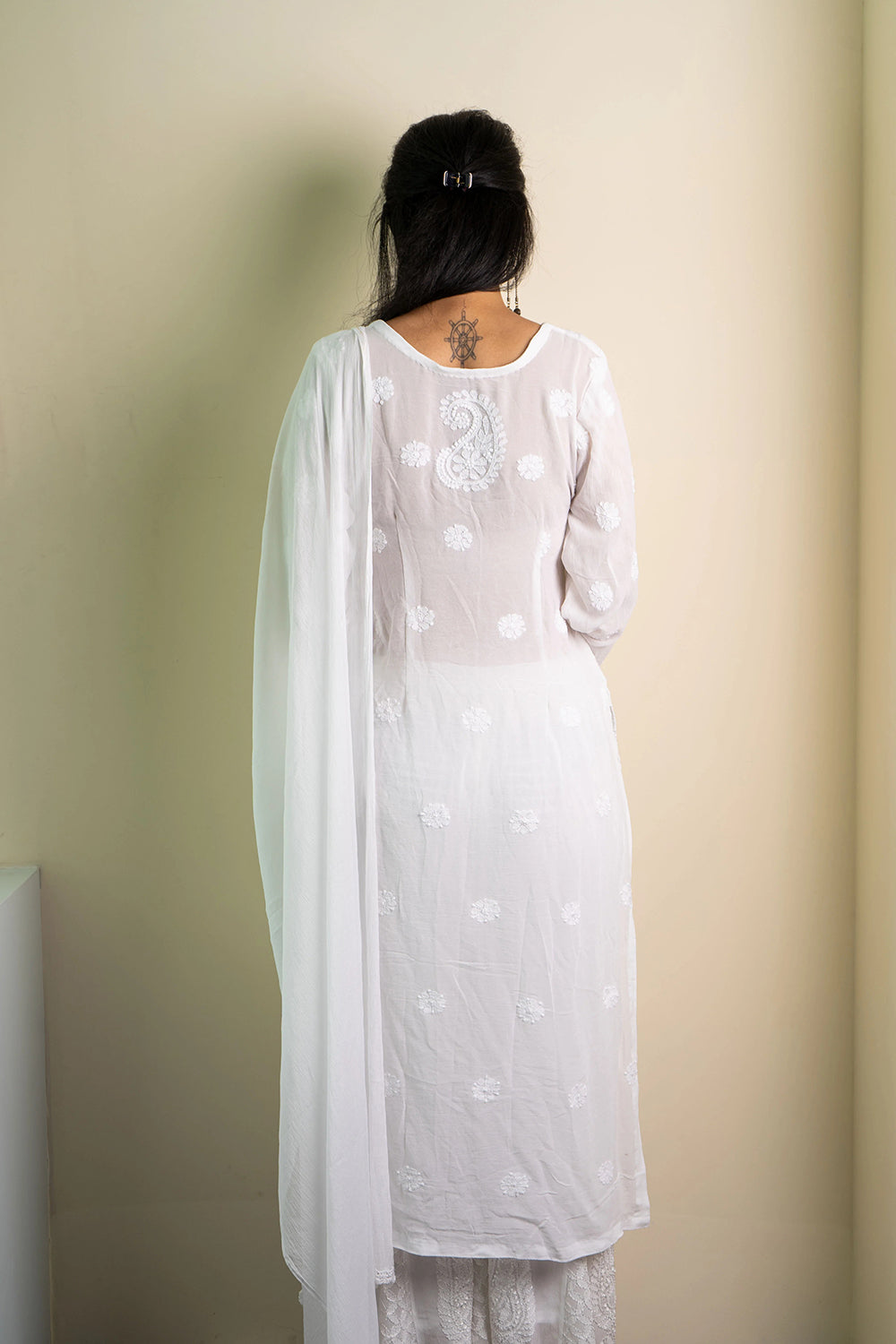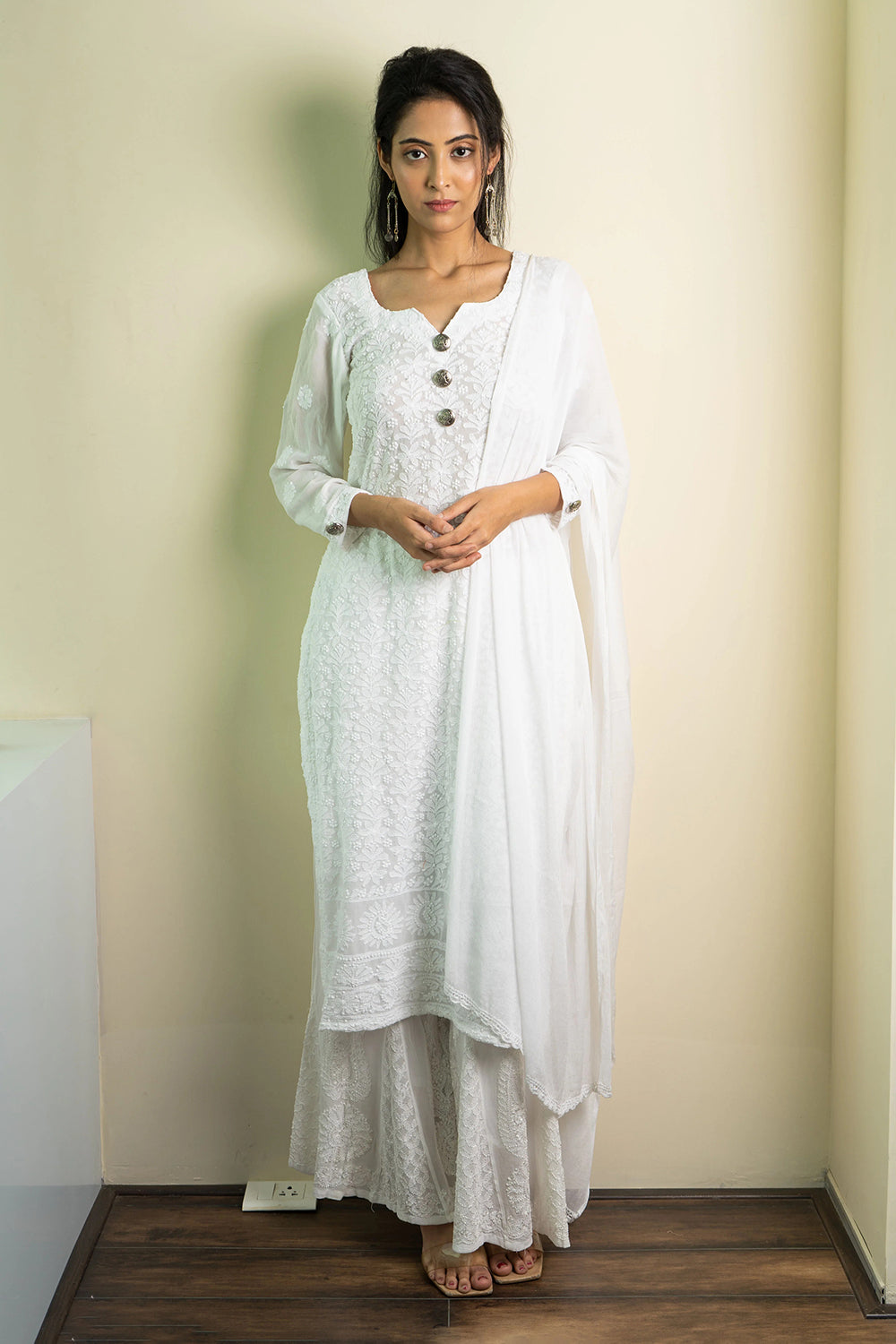 A white Chikankari suit with dupatta - button down the front to extenuate the neckline and three quarter sleeves. Paired with a solid white dupatta and sharara.