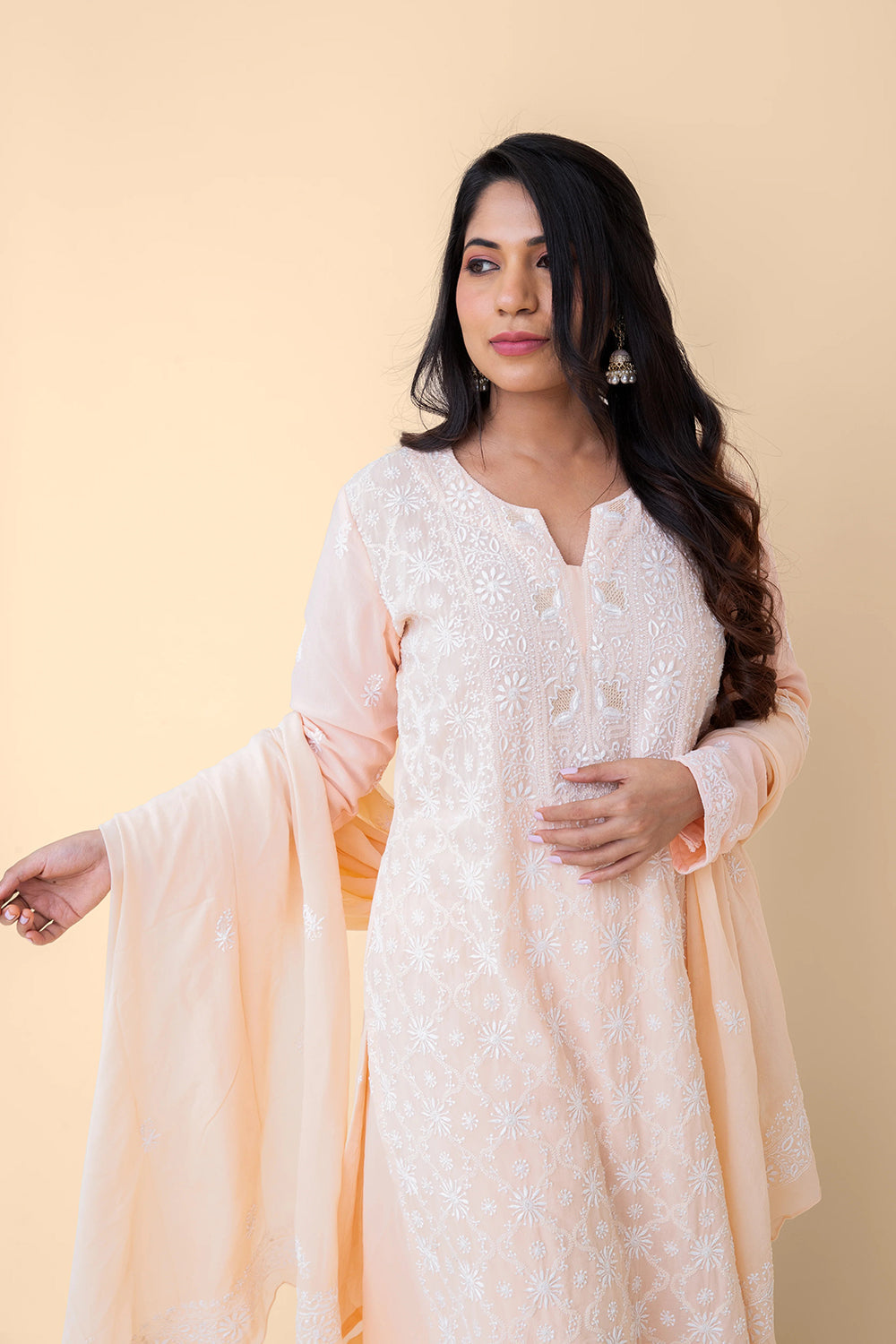 Chikankari embroidery will be similar to the images shown. Color, Highlights & Silhouettes remain the same.