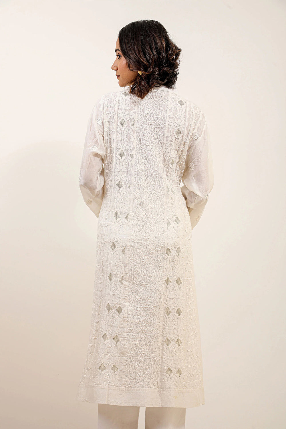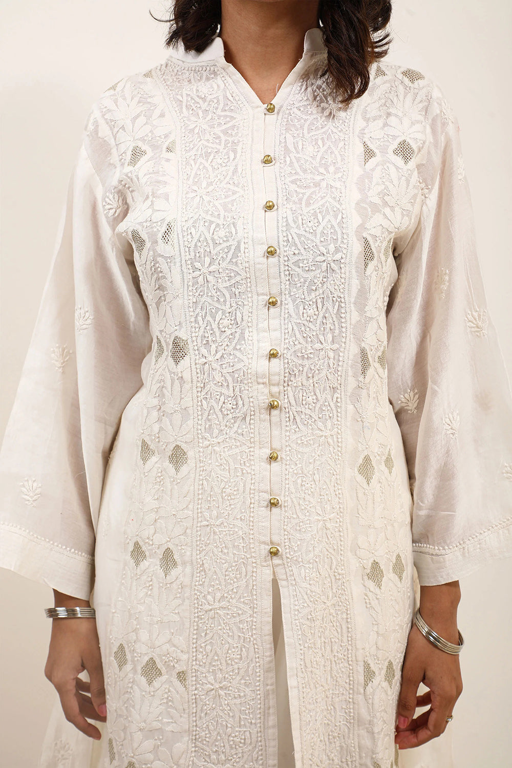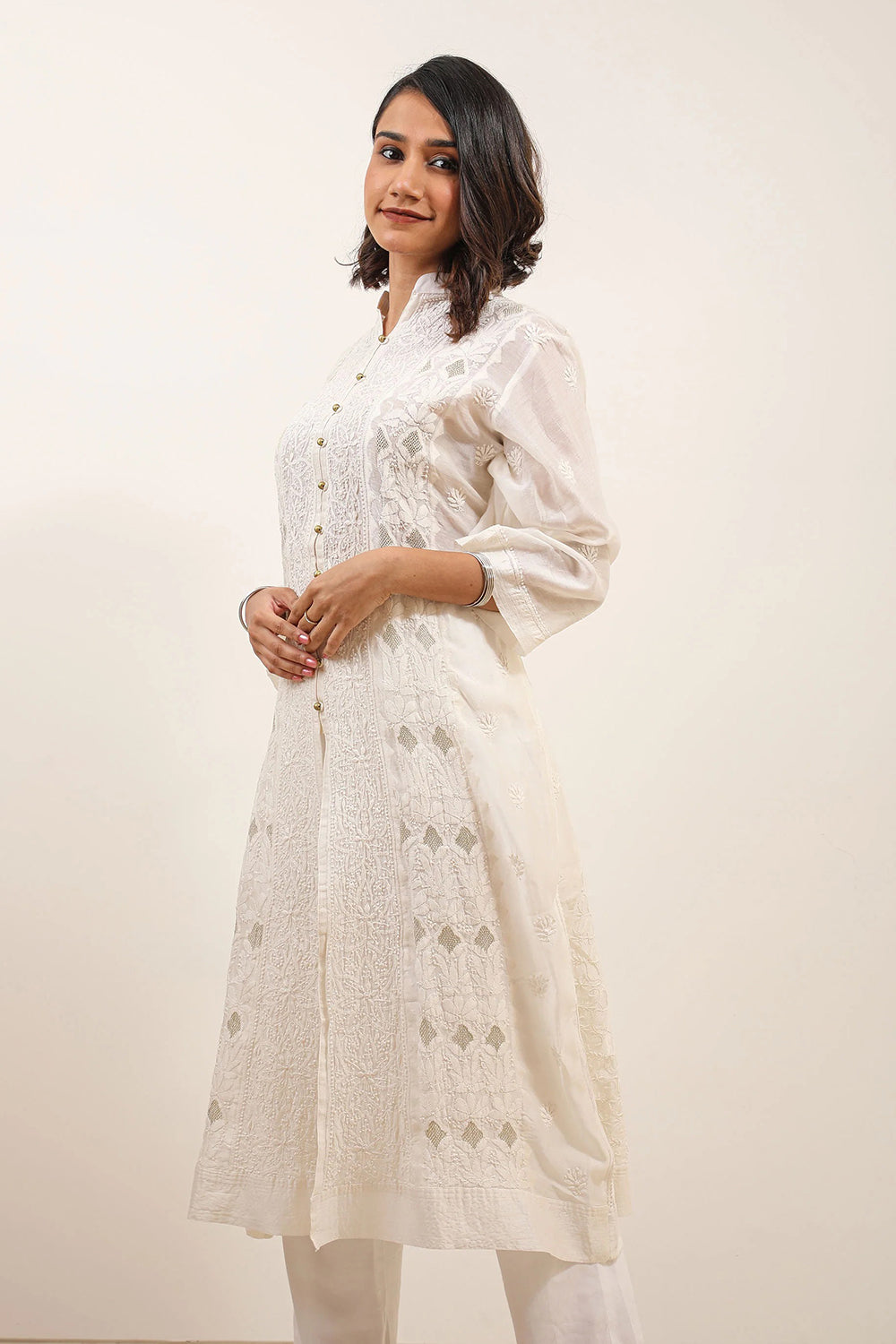 Keep it subtle and chic in this pure white Chikankari Kurta with three quarter sleeves and luxe button detailing - a dynamic ensemble. Designed in master craftsmanship of jal work panelling for you to express your elegance.