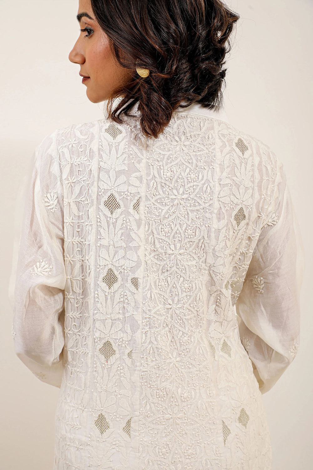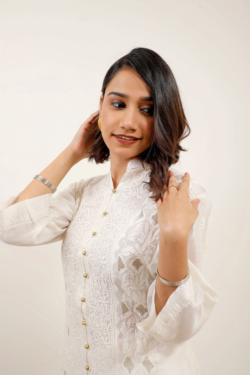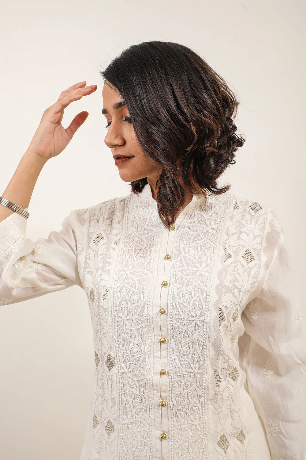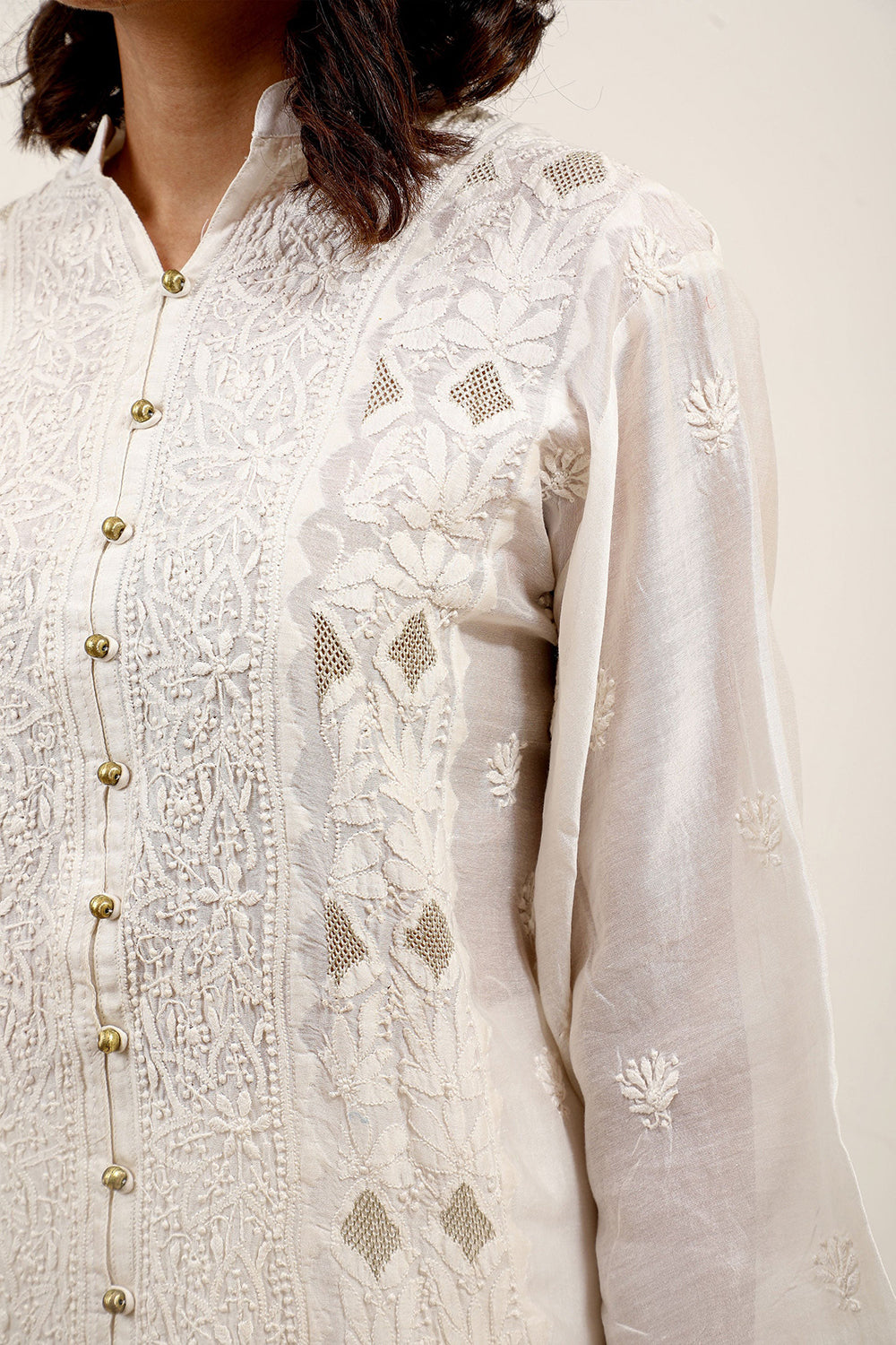 Keep it subtle and chic in this pure white Chikankari Kurta with three quarter sleeves and luxe button detailing - a dynamic ensemble. Designed in master craftsmanship of jal work panelling for you to express your elegance.