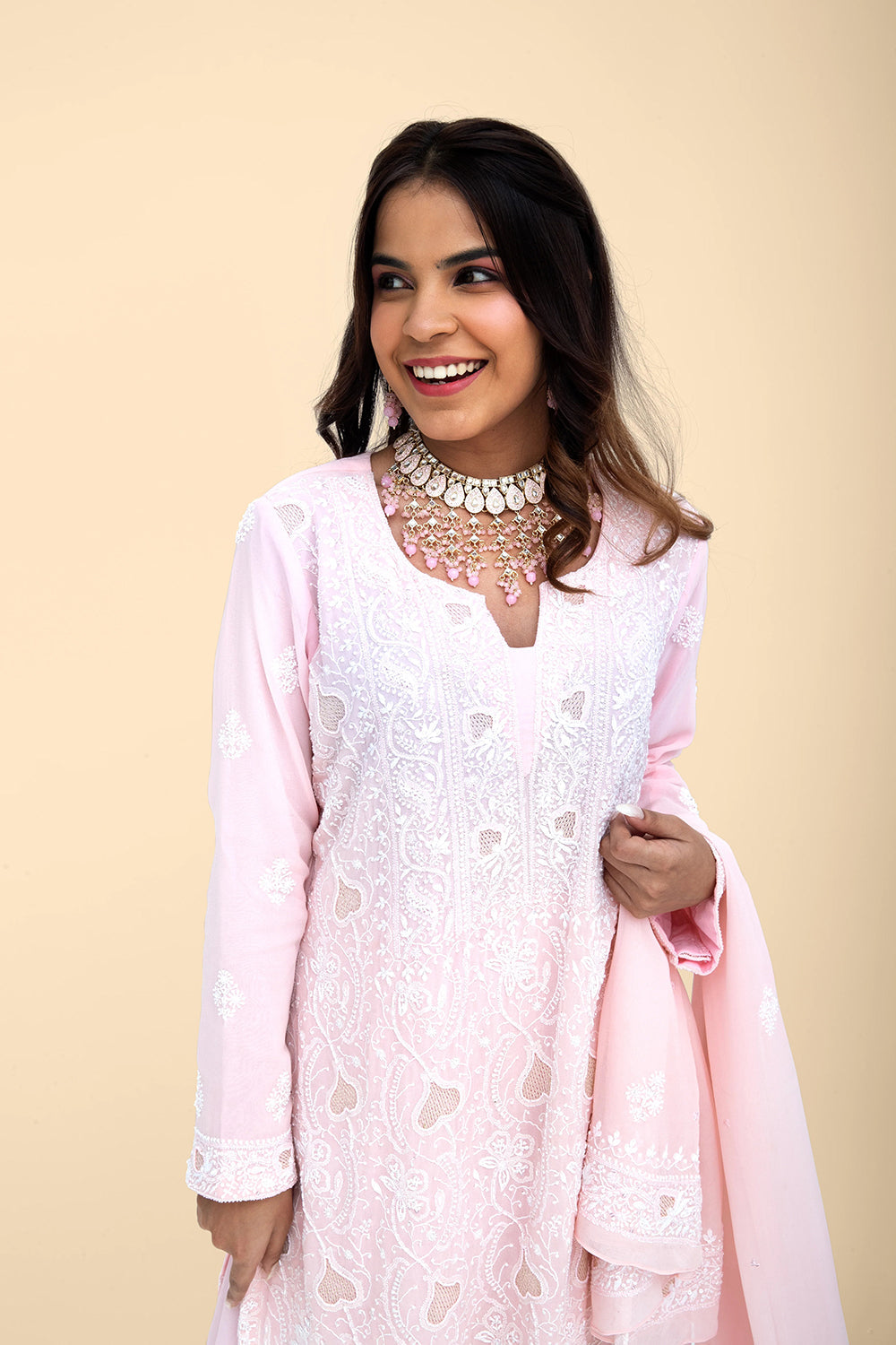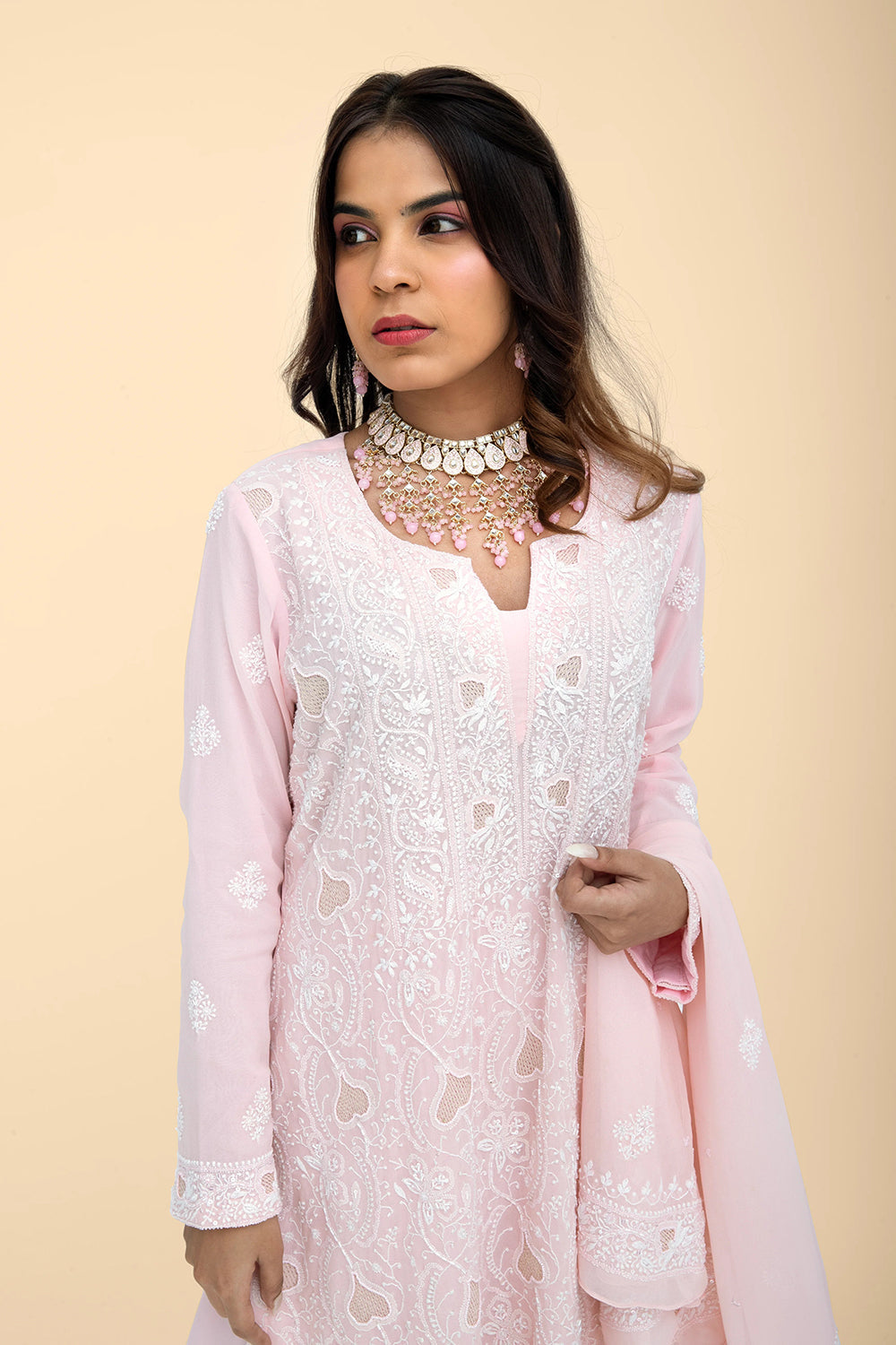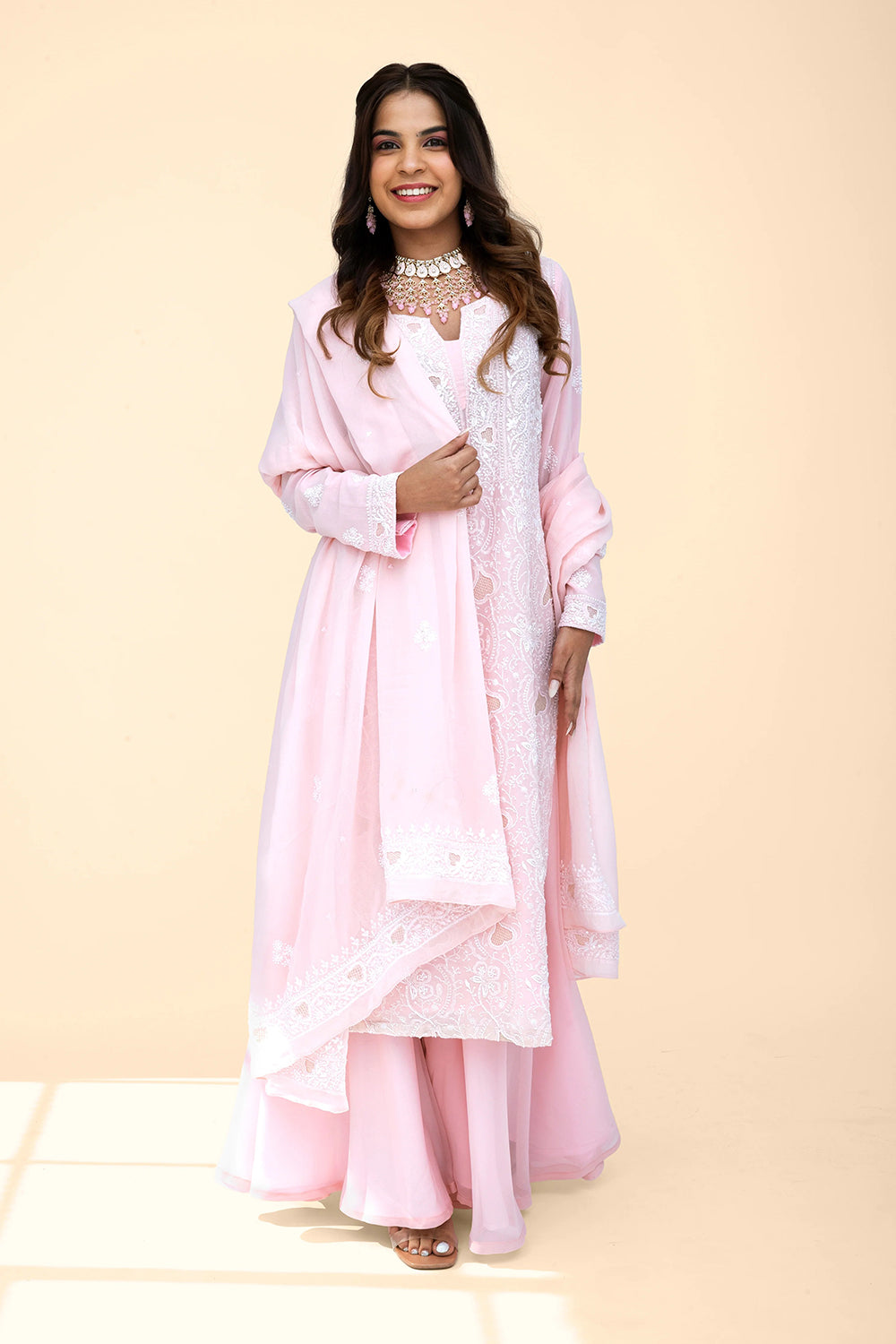 Chikankari embroidery will be similar to the images shown. Color, Highlights & Silhouettes remain the same.