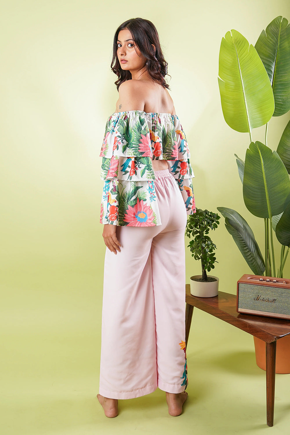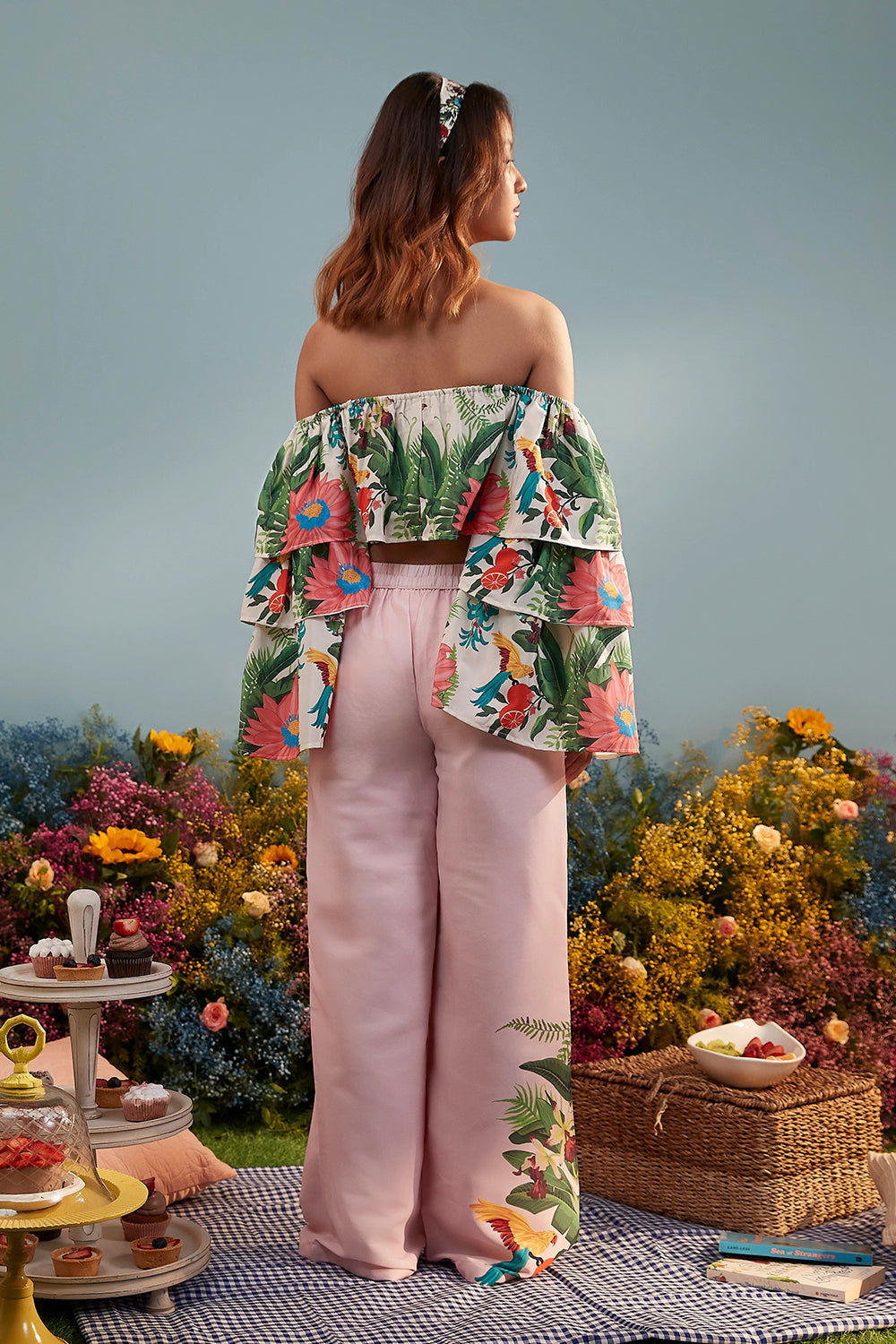Description: A chic off-shoulder top adorned with our signature tropical prints, featuring bold floral and botanical elements. The flowy ruffled sleeves and relaxed fit make it a playful wardrobe essential as it can be styled in multiple ways.