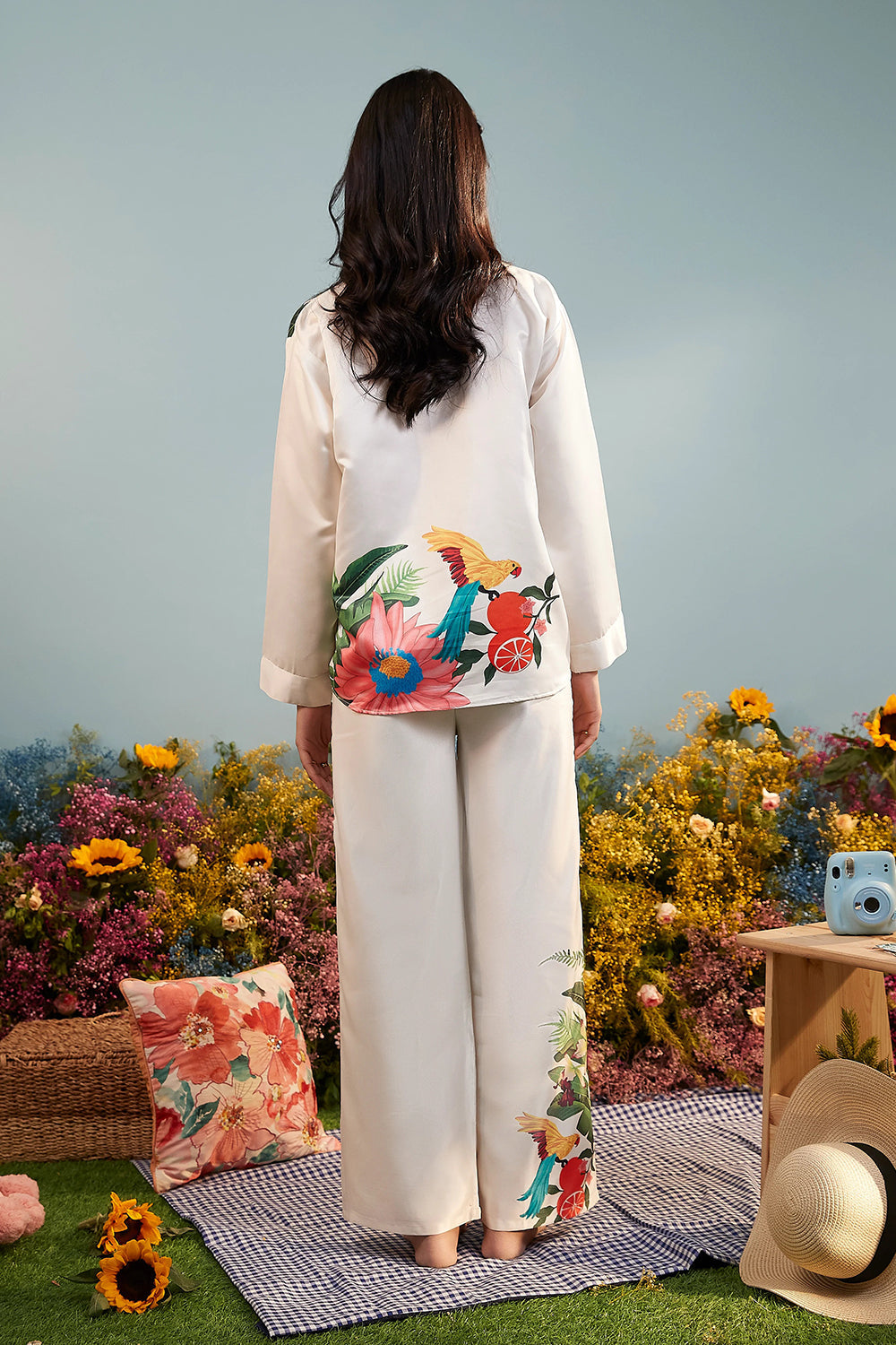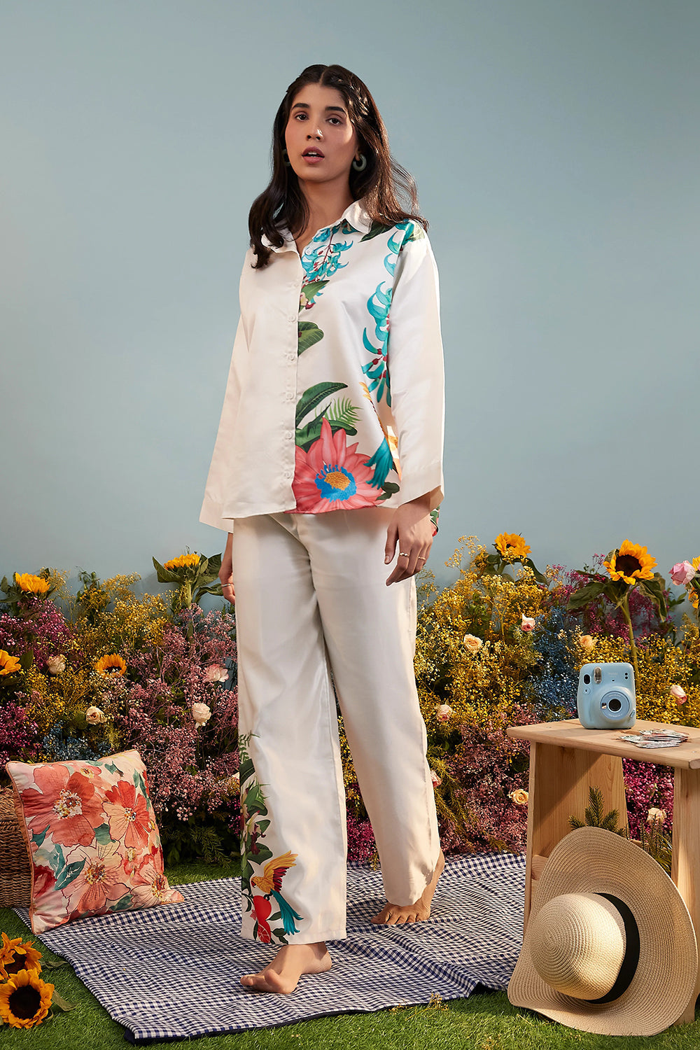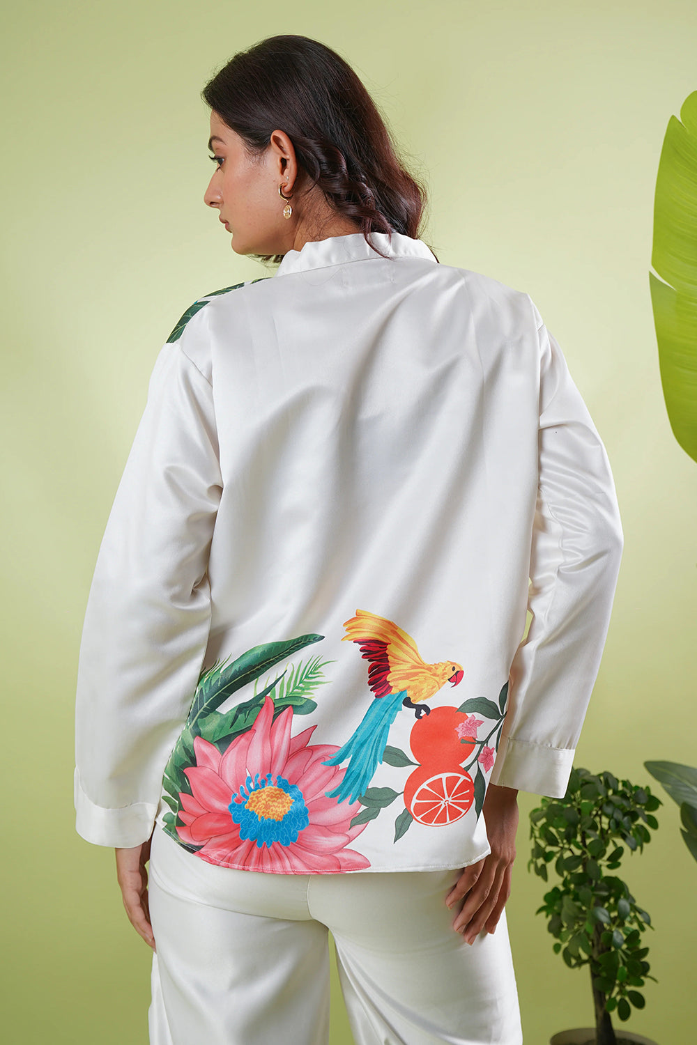 Description: A classic white satin shirt featuring a relaxed fit and crisp collar, elevated with asymmetrical tropical prints. The bold botanical details add a refreshing twist to this timeless staple, making it effortlessly stylish. This product is best paired with our Peace On The Beach Pants as a co-ord set.