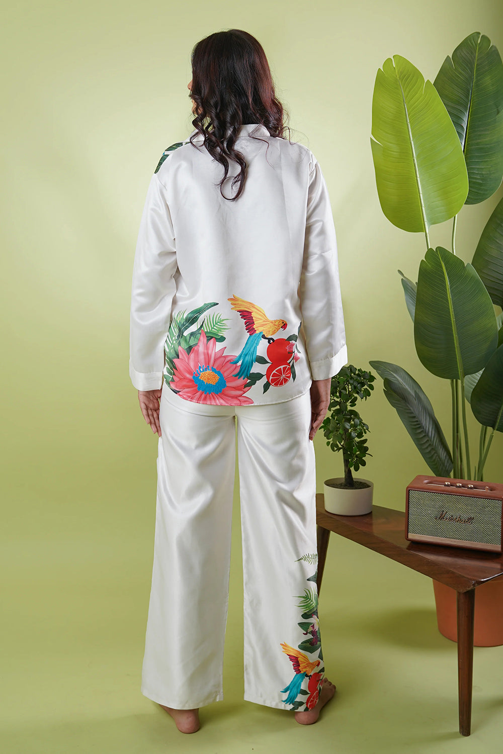 Description: These sophisticated wide-leg pants in satin fabric are elevated with striking tropical prints along the hem. The lush botanical motifs bring a lively touch to the flowing silhouette, perfect for a statement look.