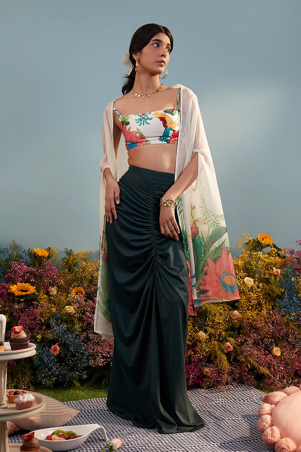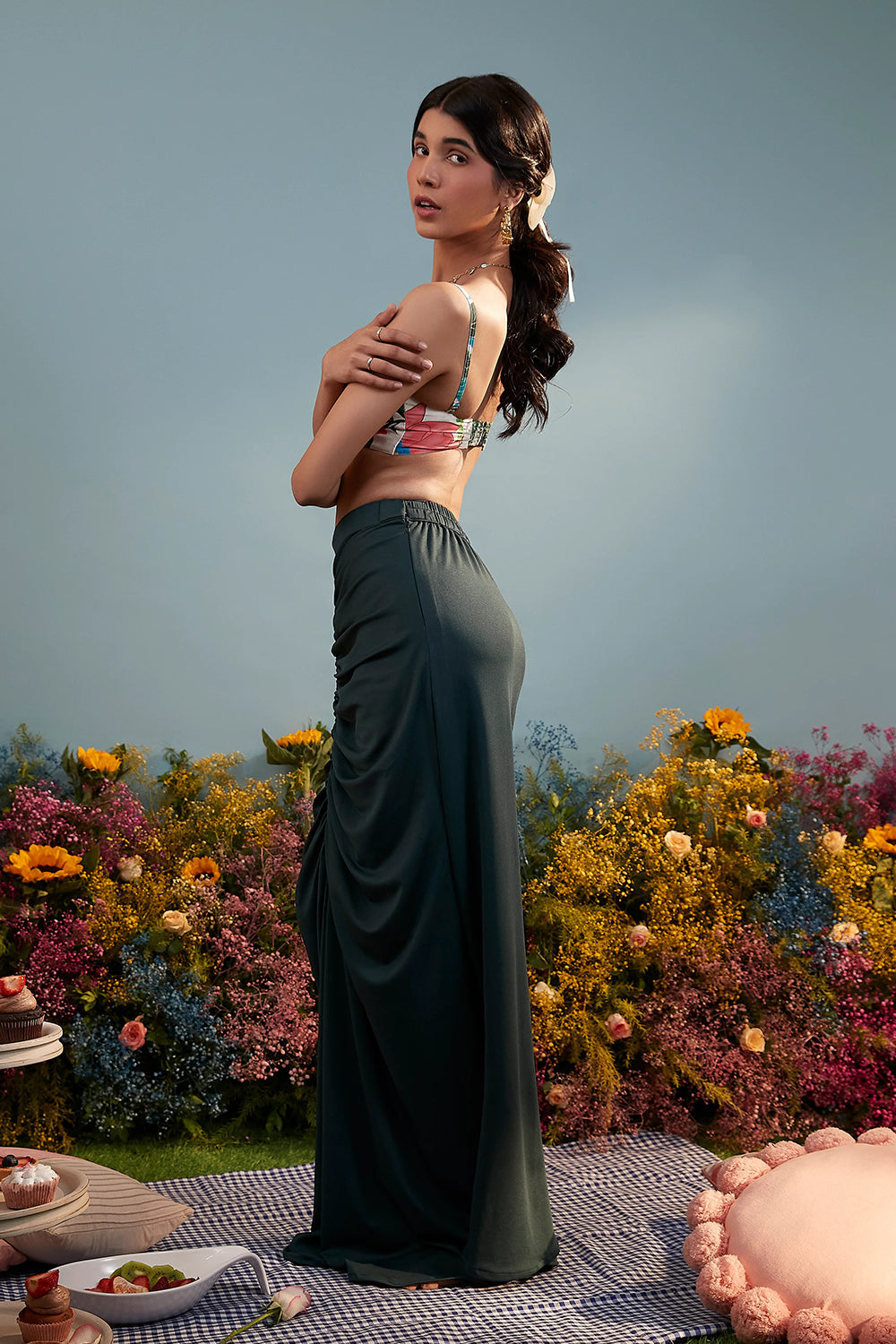 Description: A gracefully draped green skirt with a flattering silhouette, which can be styled in numerous ways. The fluid design adds movement and elegance, making it a versatile statement piece.