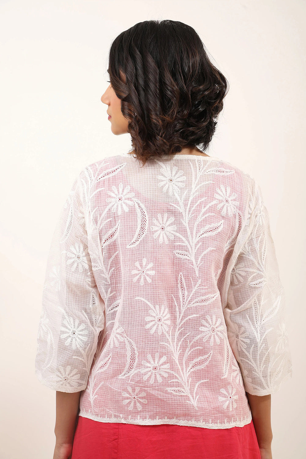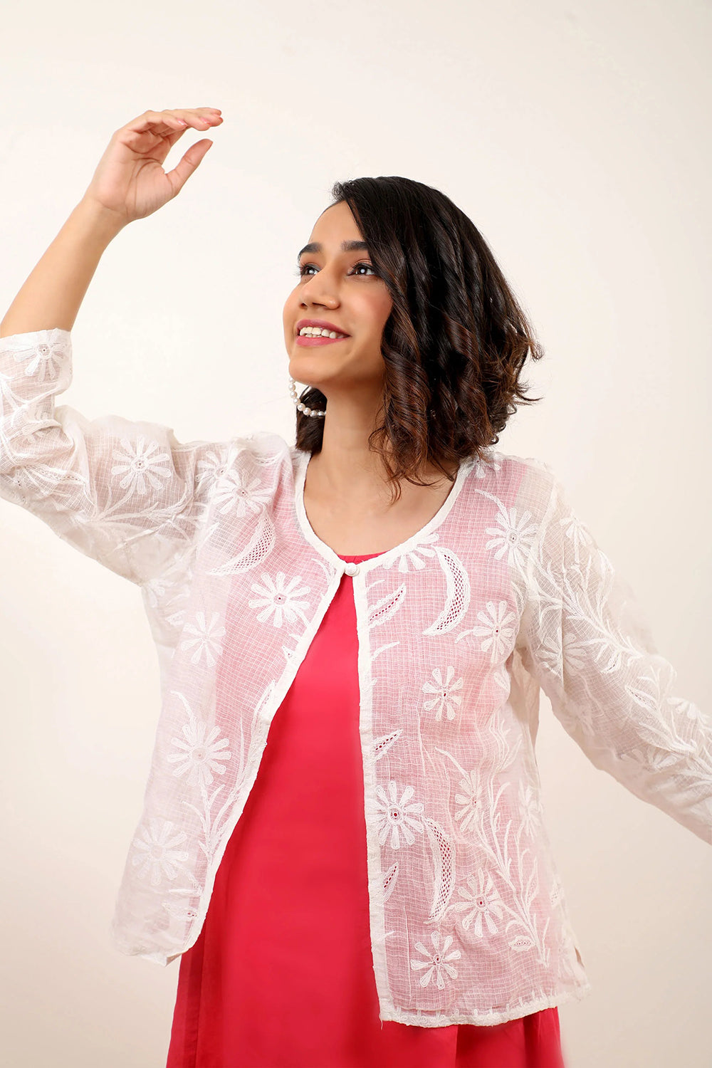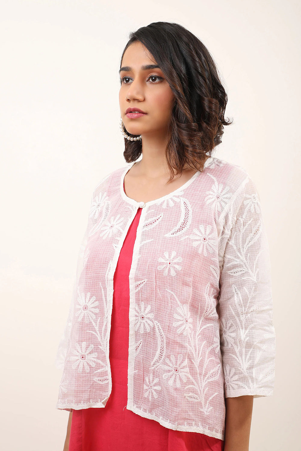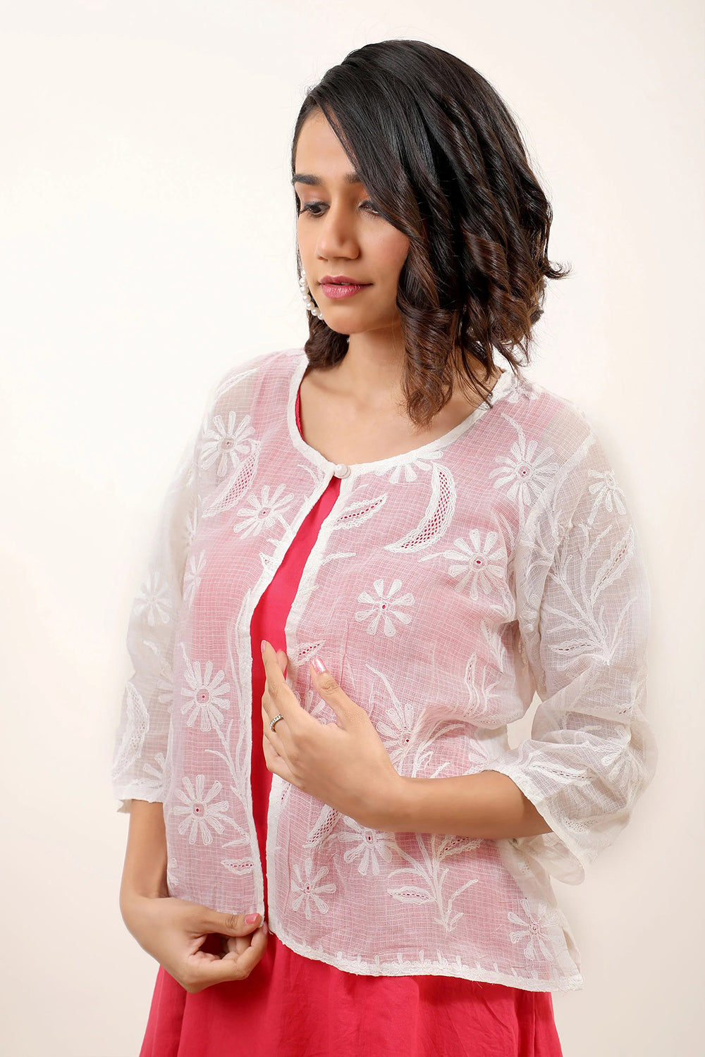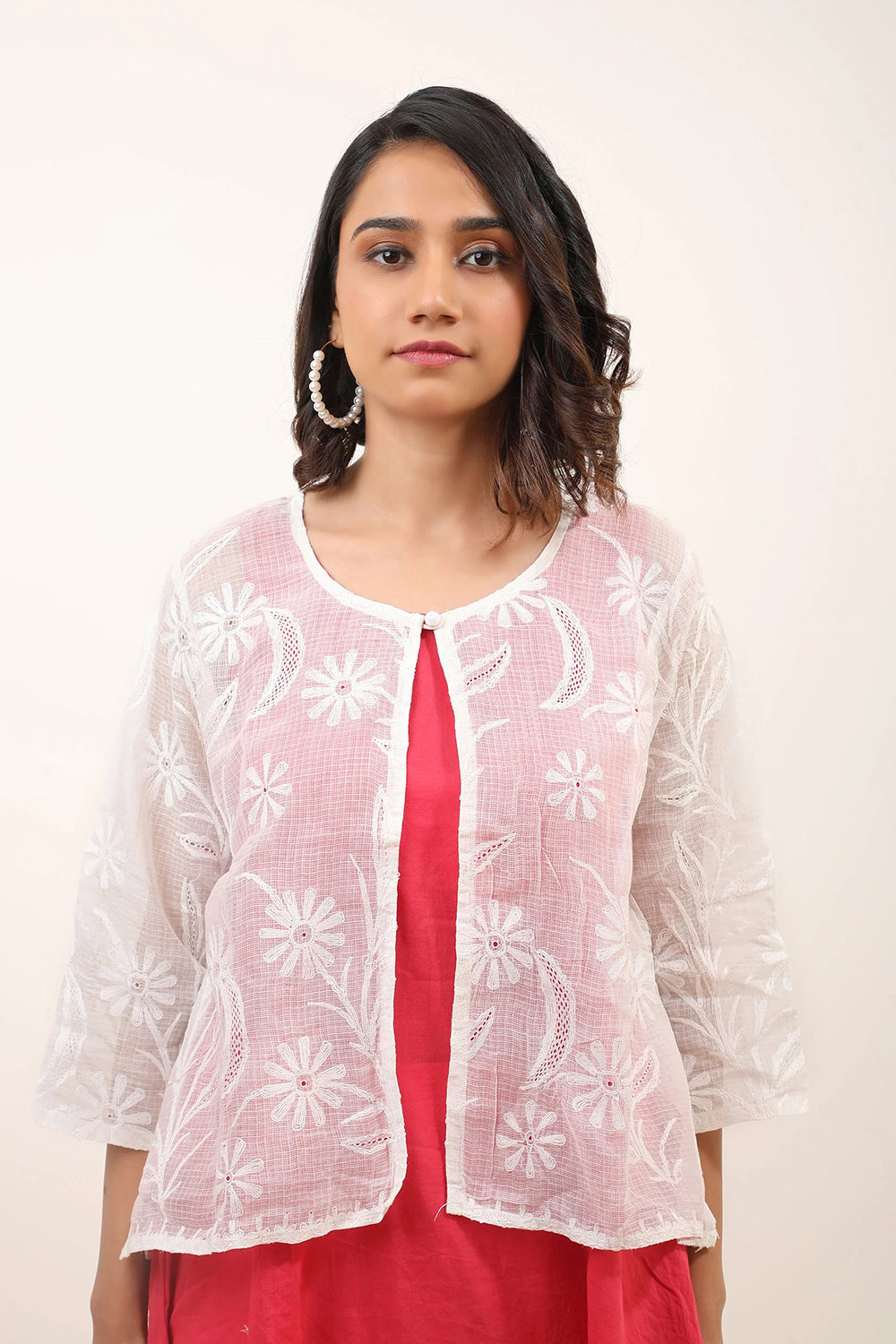 A head turning layering piece - white cardigan highlighted with traditional Chikankari work and jali detailing stylised with button and floral detailing. A minimal must have for your wardrobe.