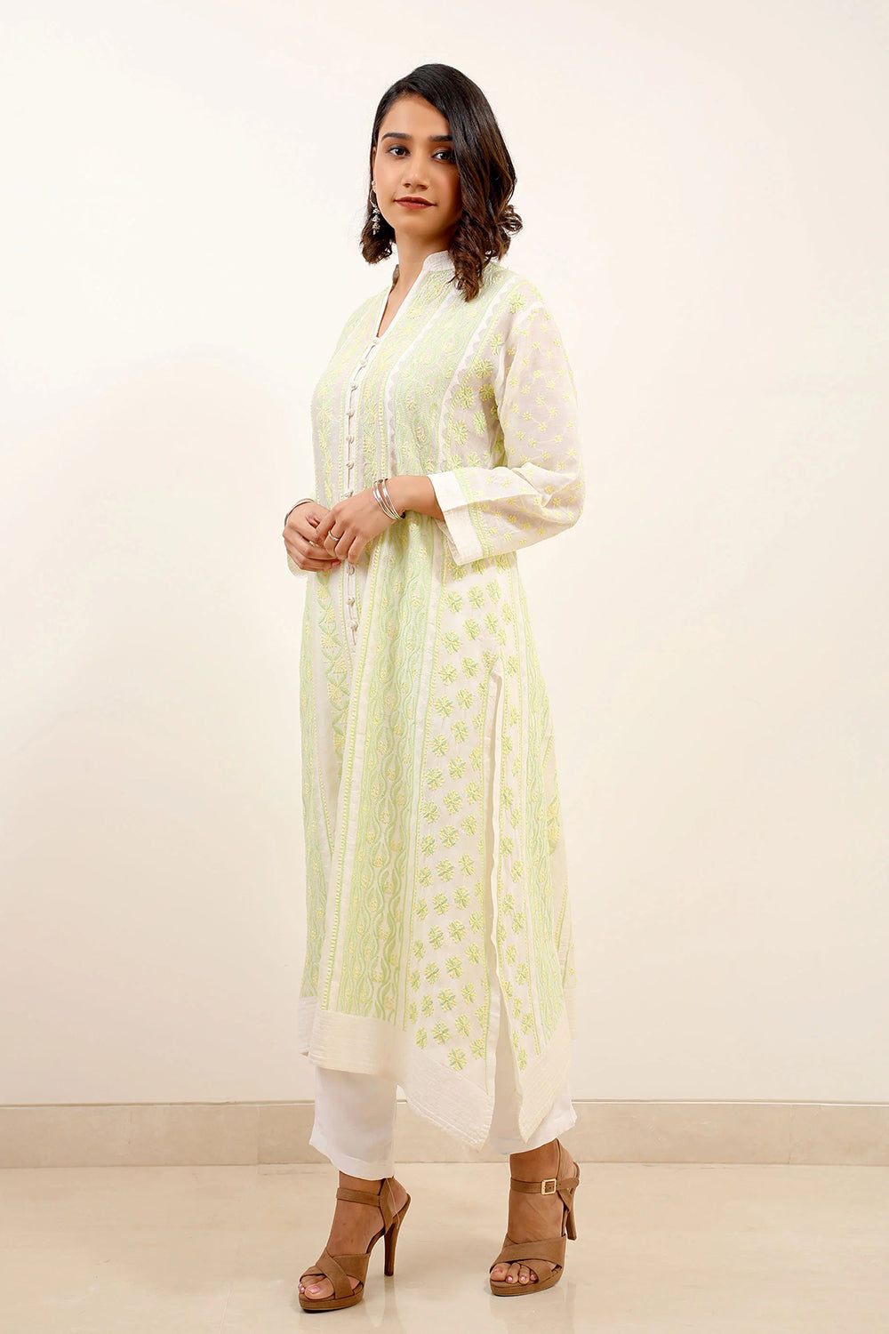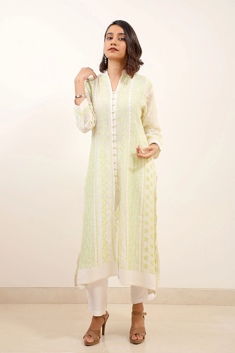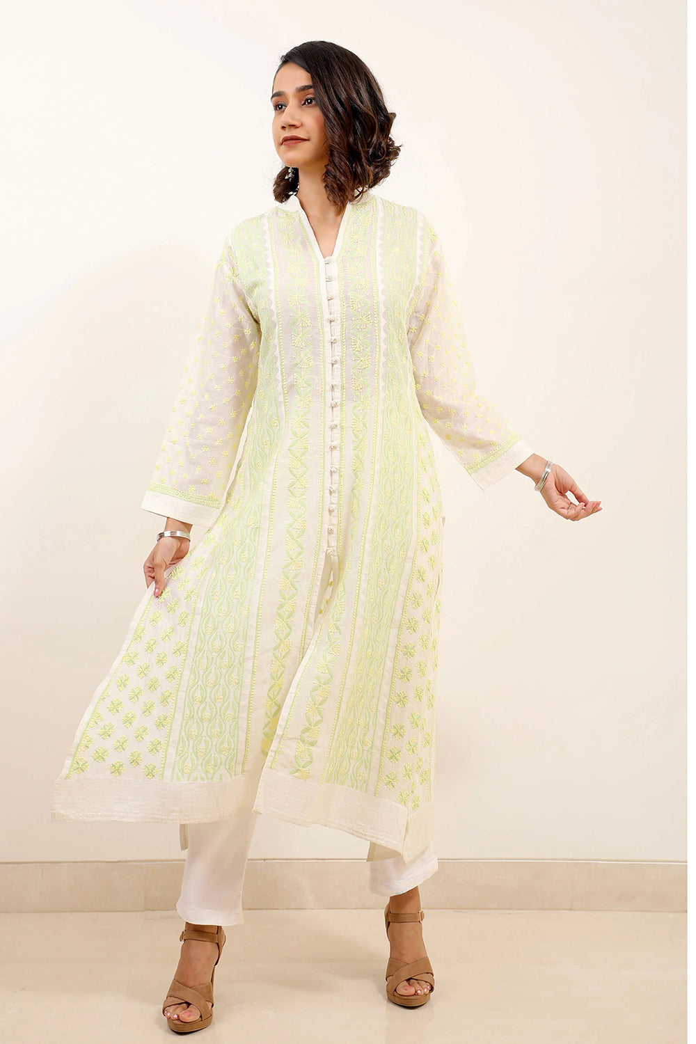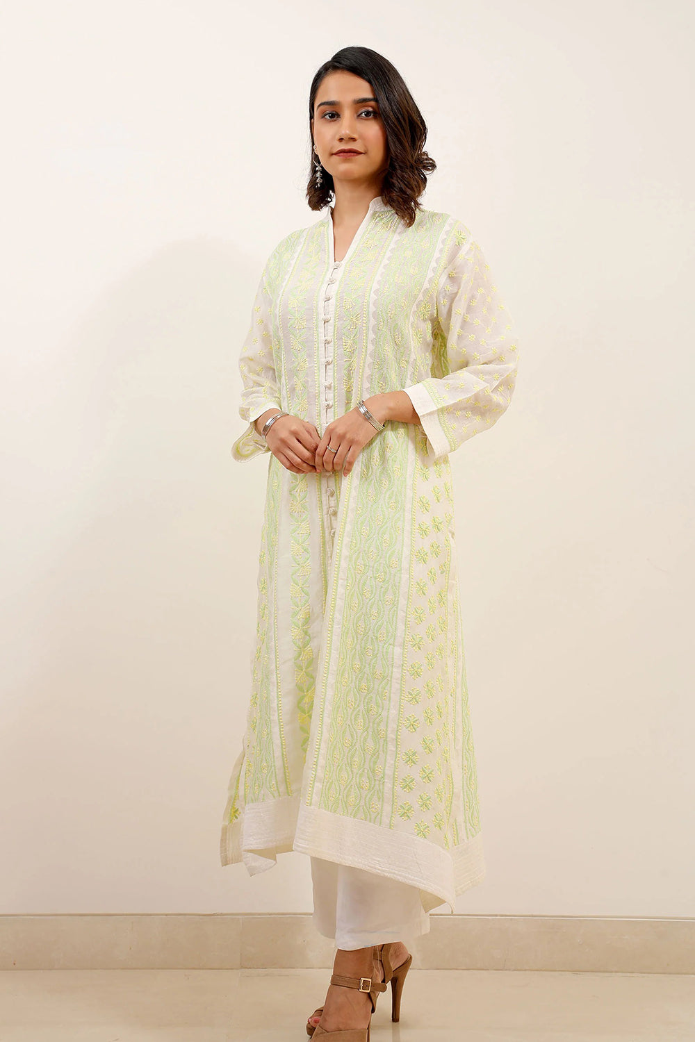 Stay in the limelight with our lime green and white Chikankari long kurta - a statement piece yet perfectly casual for all your day to night looks.