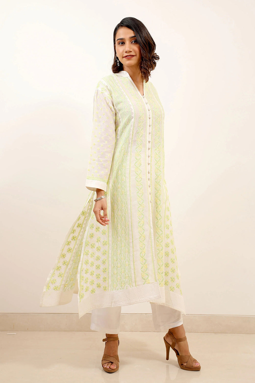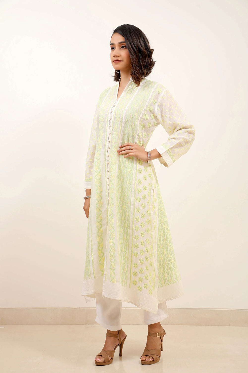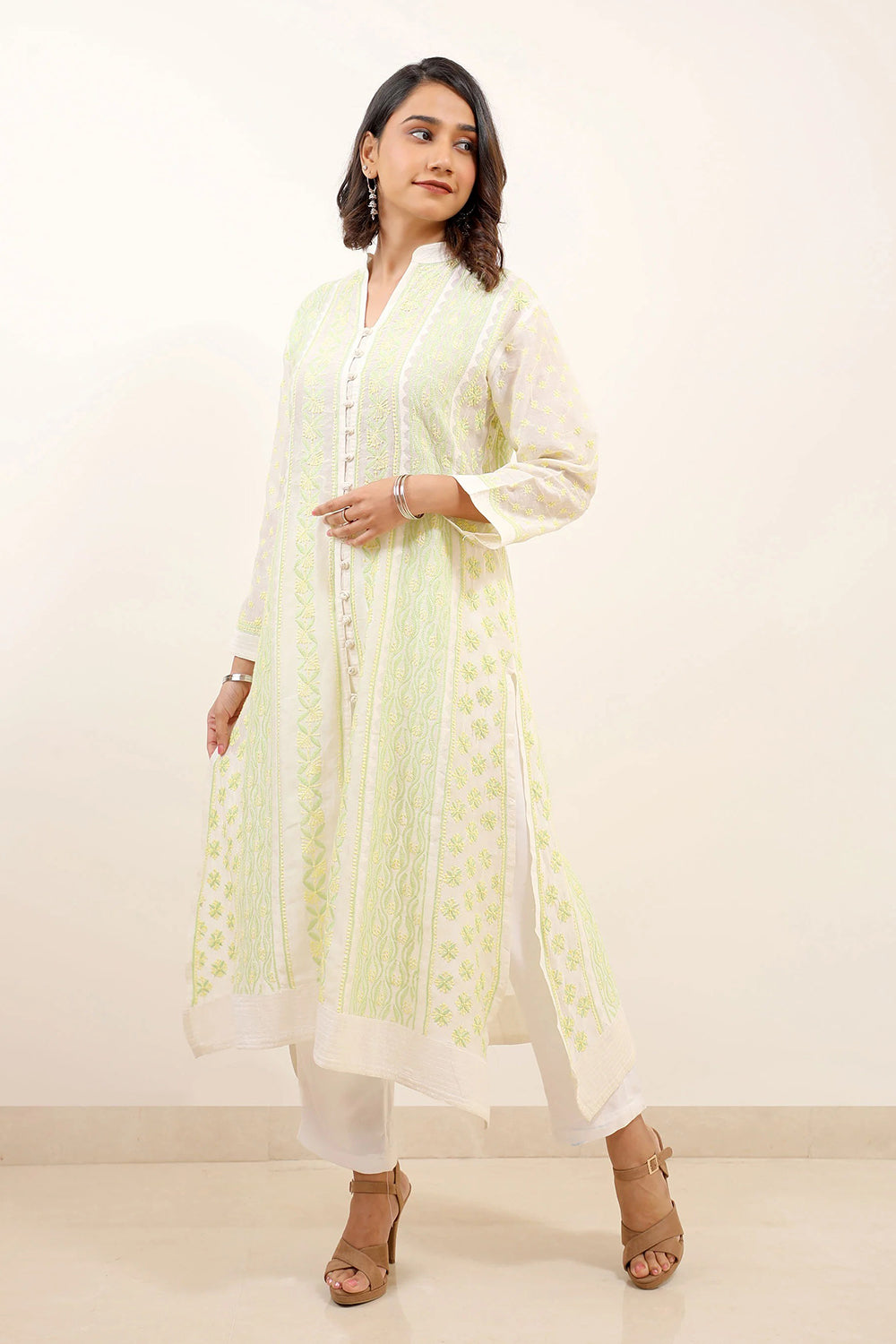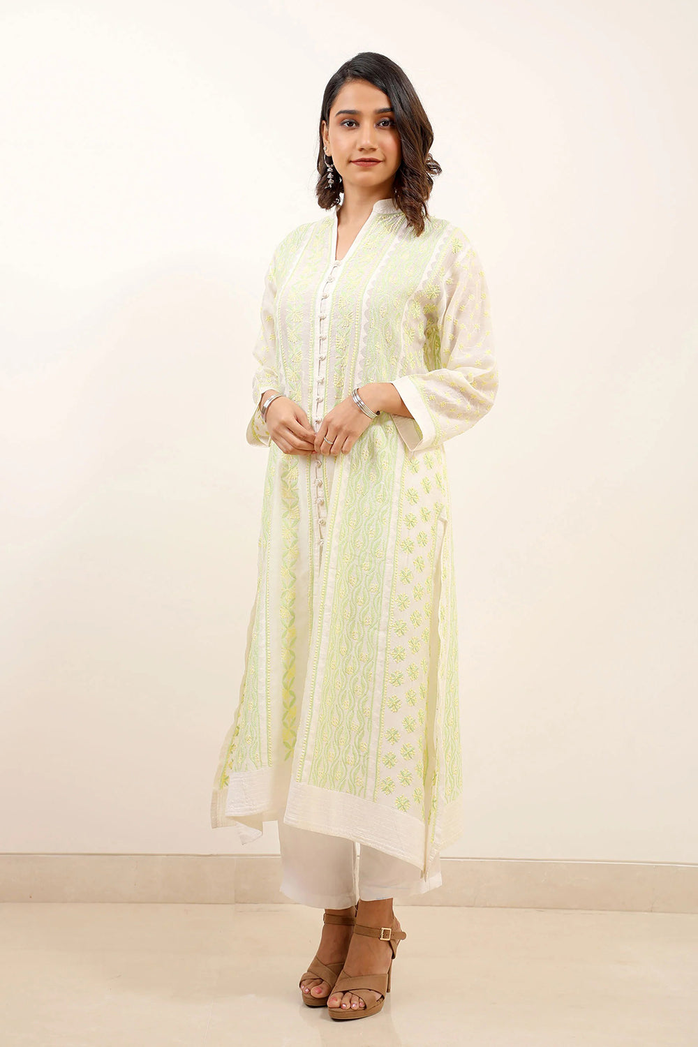 Stay in the limelight with our lime green and white Chikankari long kurta - a statement piece yet perfectly casual for all your day to night looks.