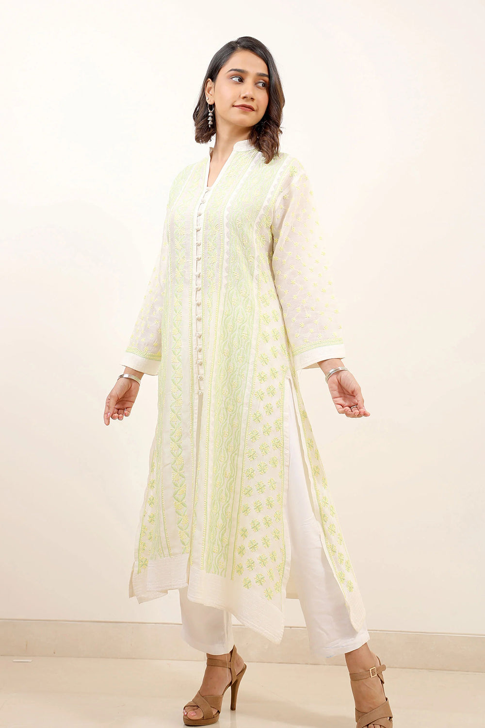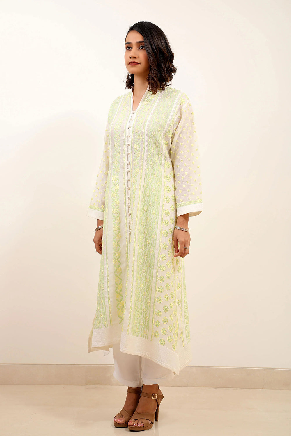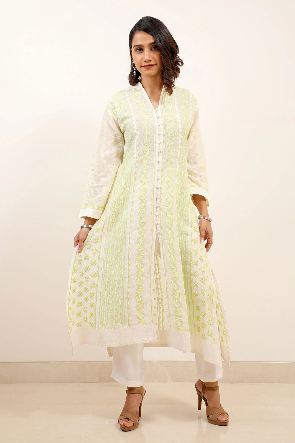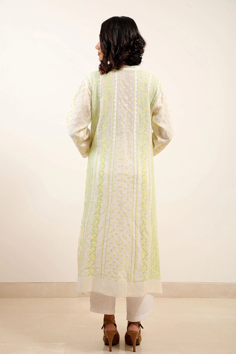 Stay in the limelight with our lime green and white Chikankari long kurta - a statement piece yet perfectly casual for all your day to night looks.