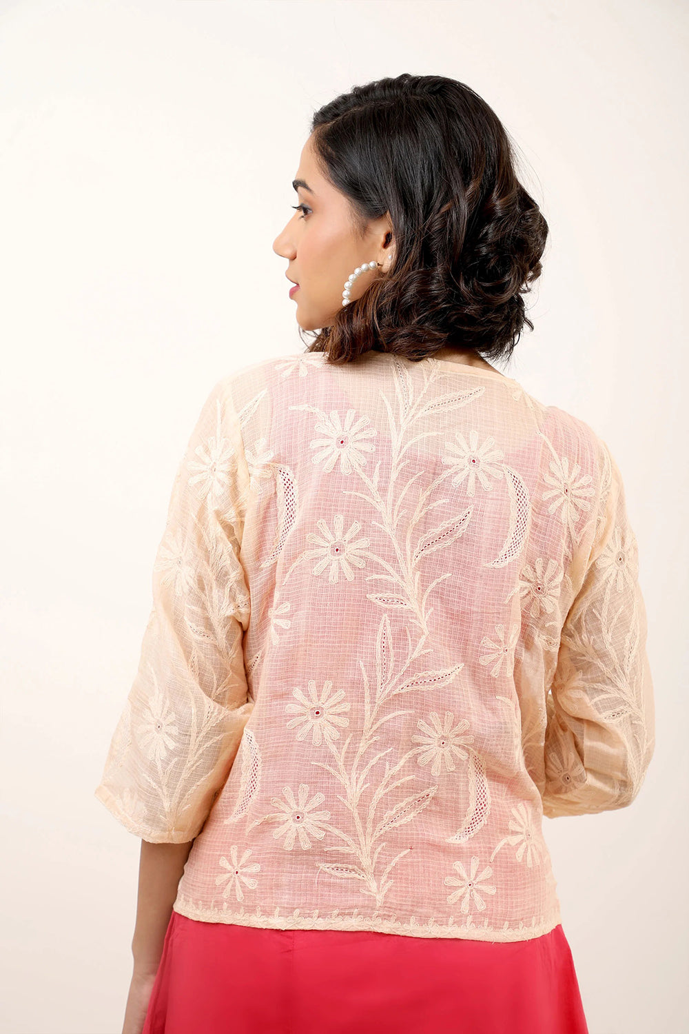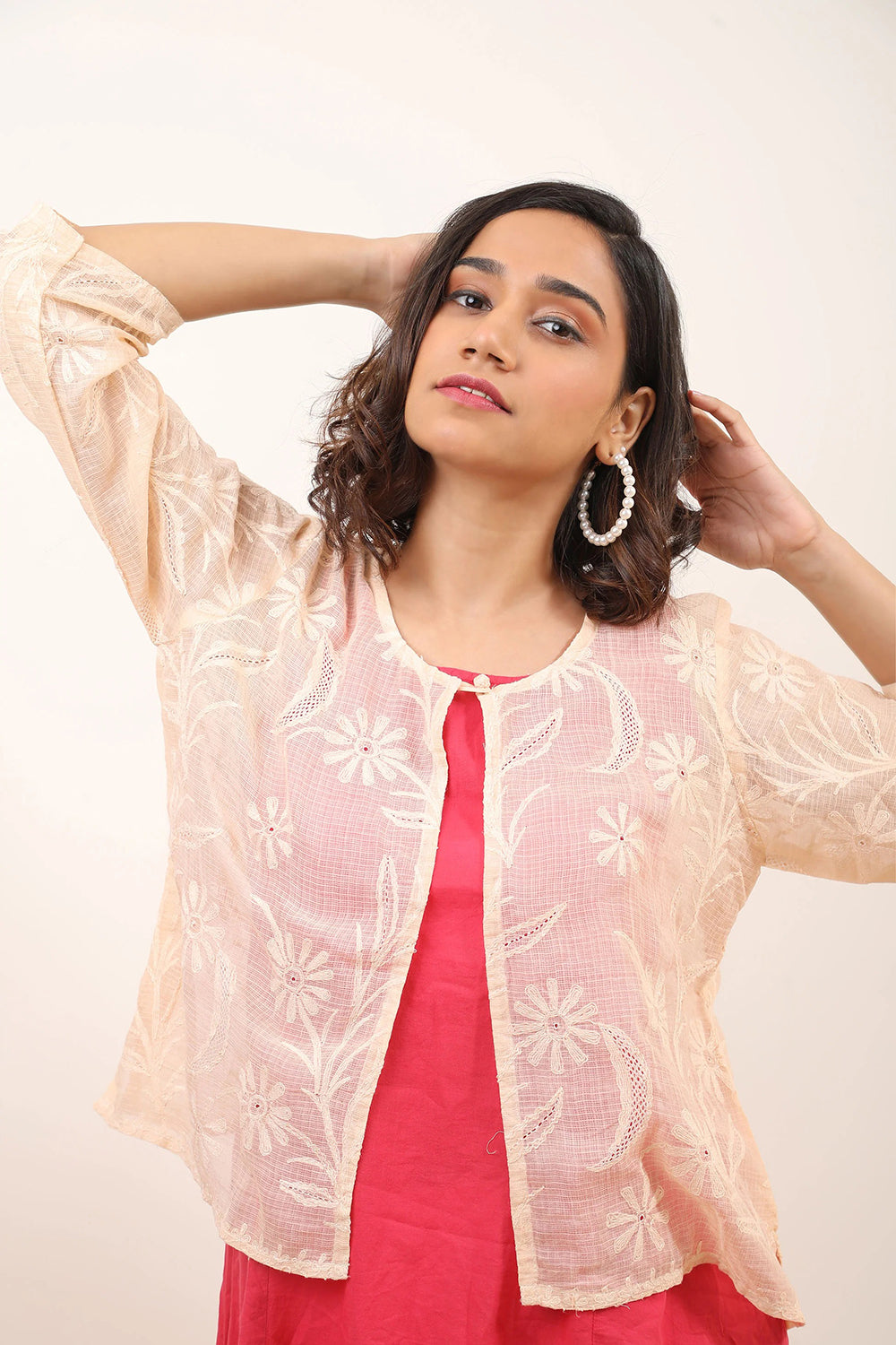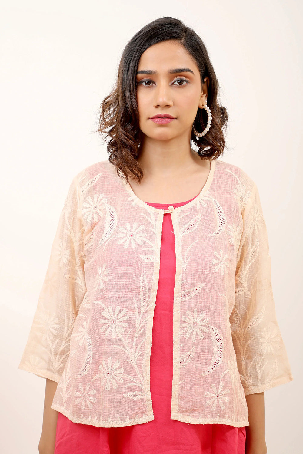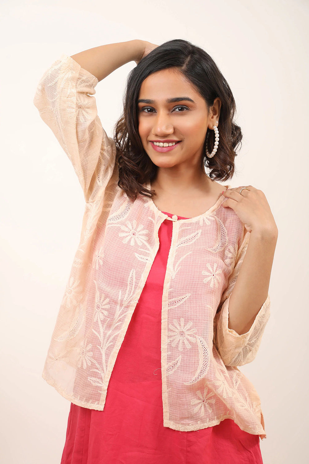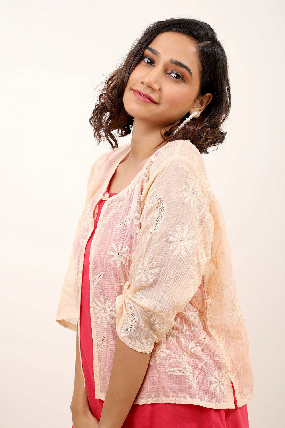 Communicate your inner elegance with this beige cardigan with detailed Chikan work - a perfect layering piece. The cardigan is uplifted with beautiful floral style embroidery and embellished with a button.