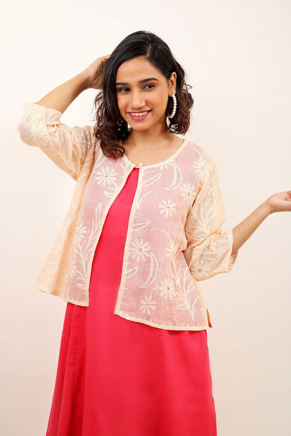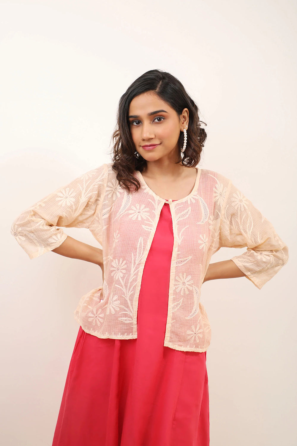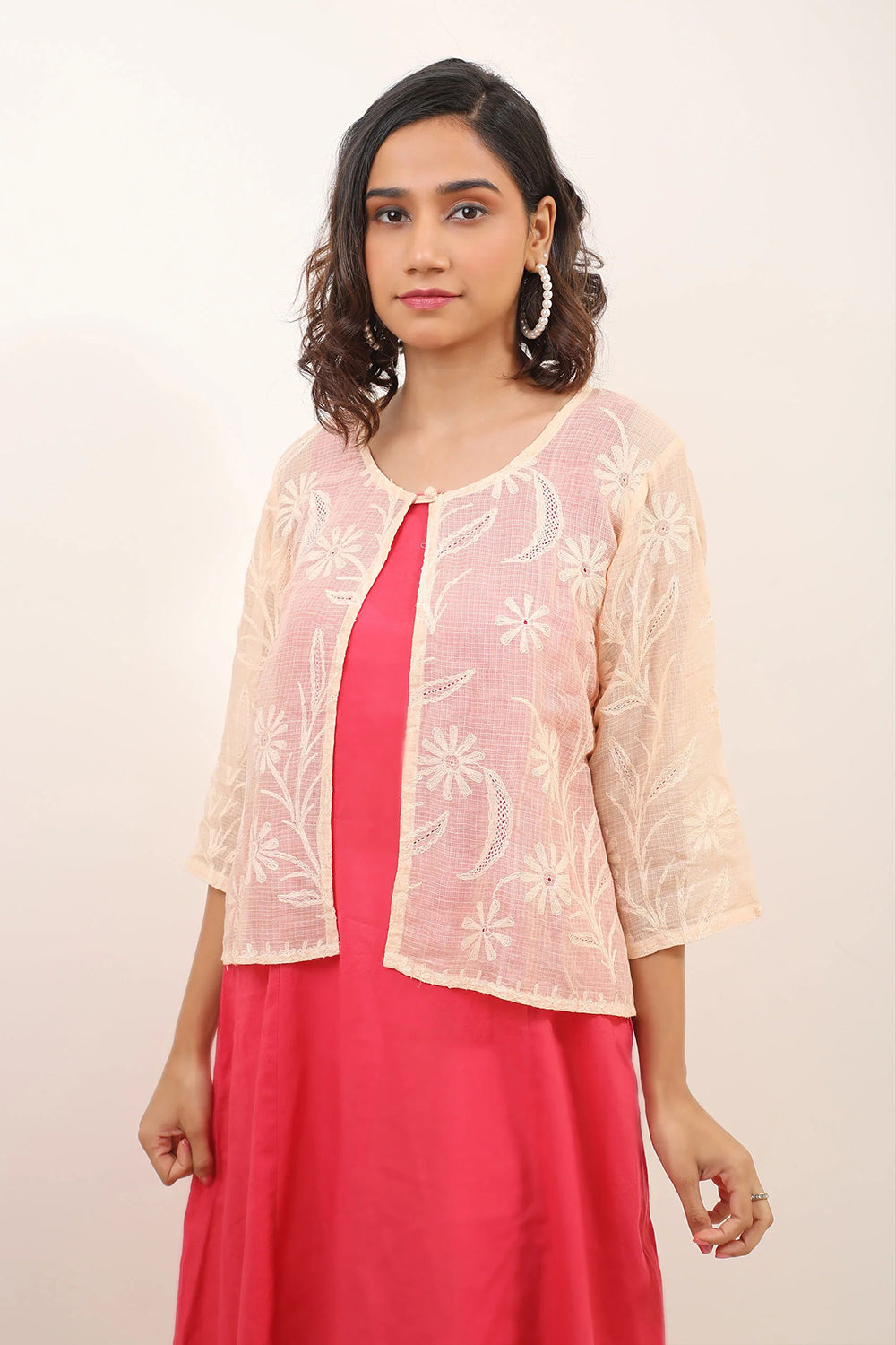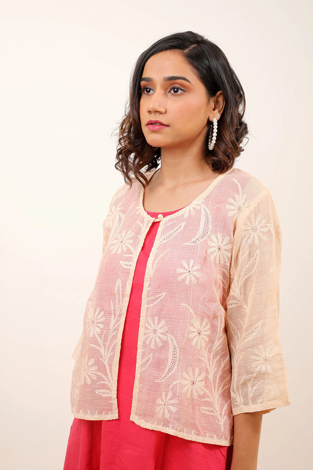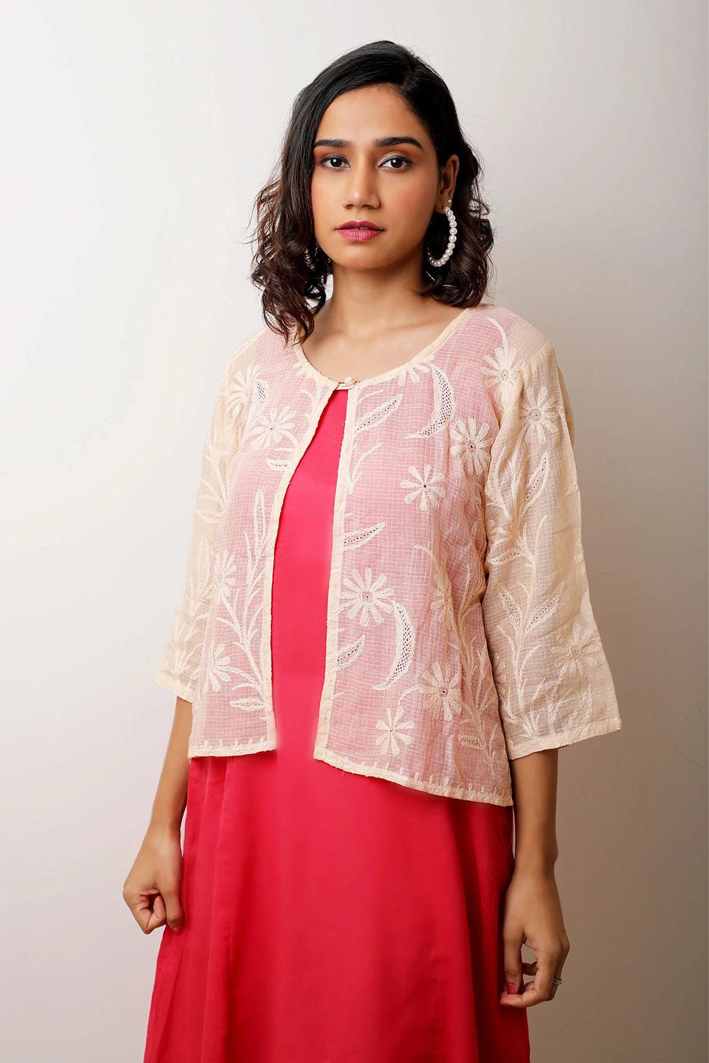 Communicate your inner elegance with this beige cardigan with detailed Chikan work - a perfect layering piece. The cardigan is uplifted with beautiful floral style embroidery and embellished with a button.