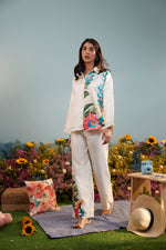 Description: These sophisticated wide-leg pants in satin fabric are elevated with striking tropical prints along the hem. The lush botanical motifs bring a lively touch to the flowing silhouette, perfect for a statement look.