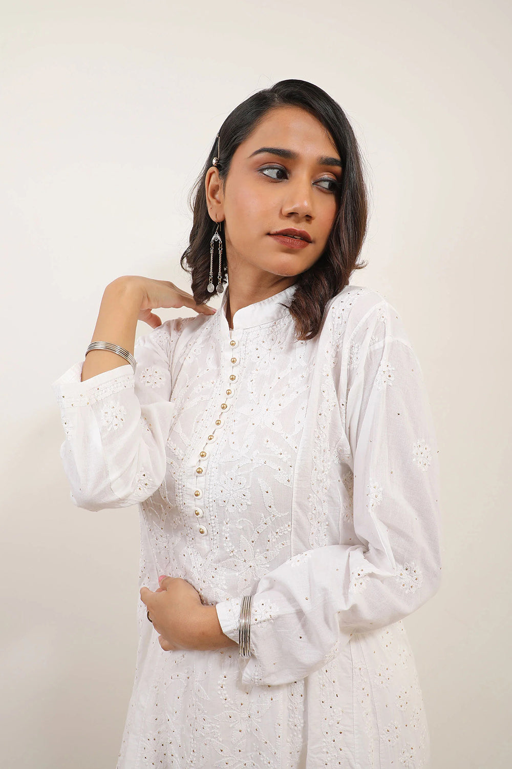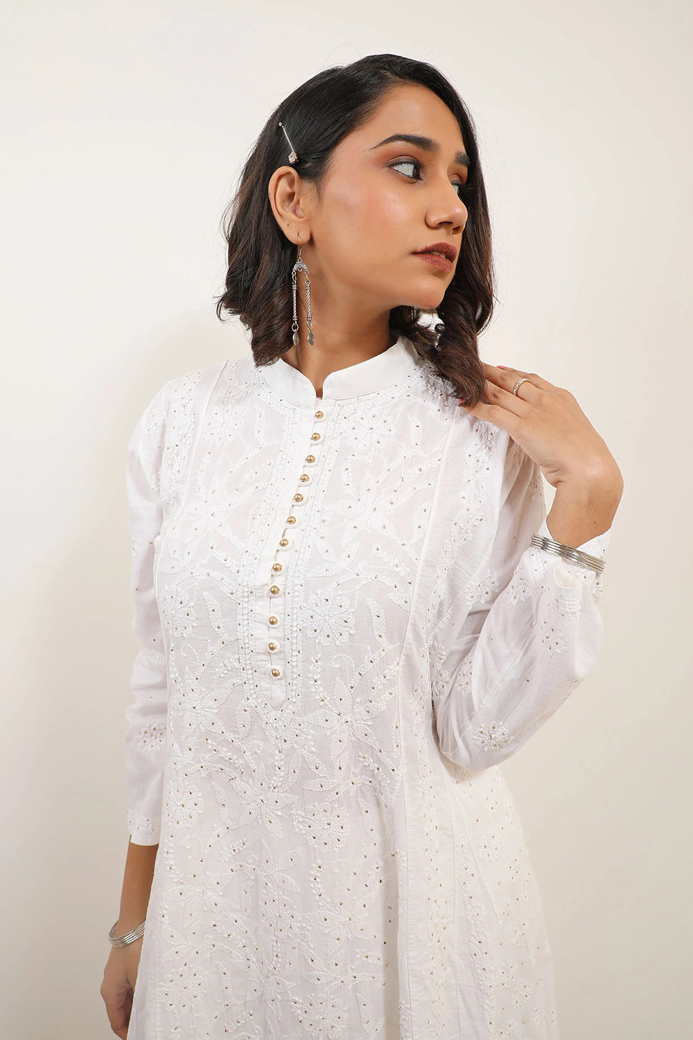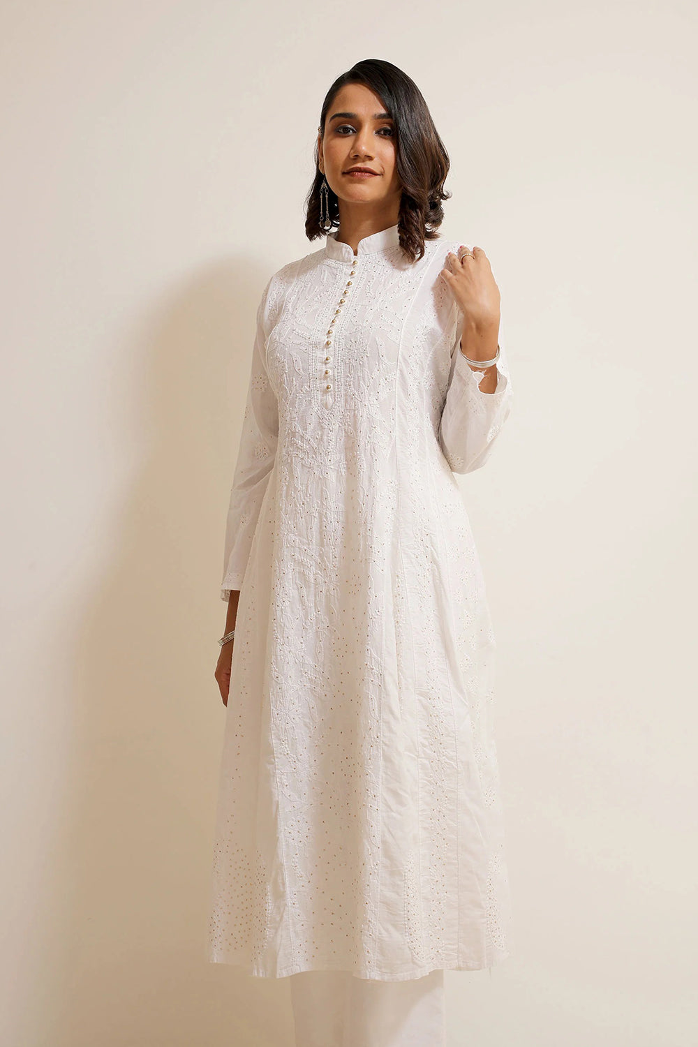 A perfect blend of gold and white - a gorgeous white kurta uplifted Chikankari work. The look is further completed with gold Mukaish detailing to help you win hearts. It is embraced in breathable Chanderi fabric and is featherweight, catering to all your aesthetics.