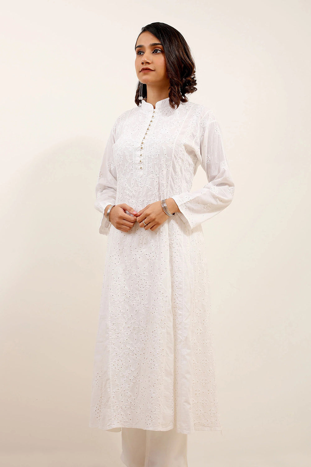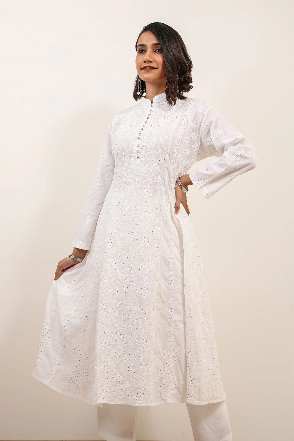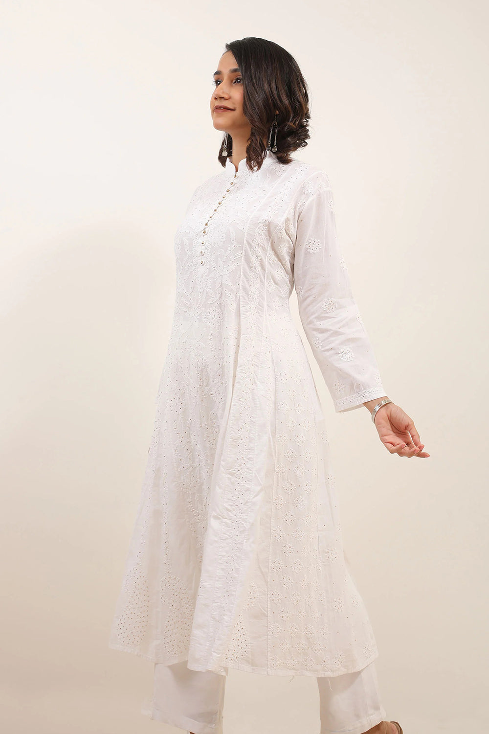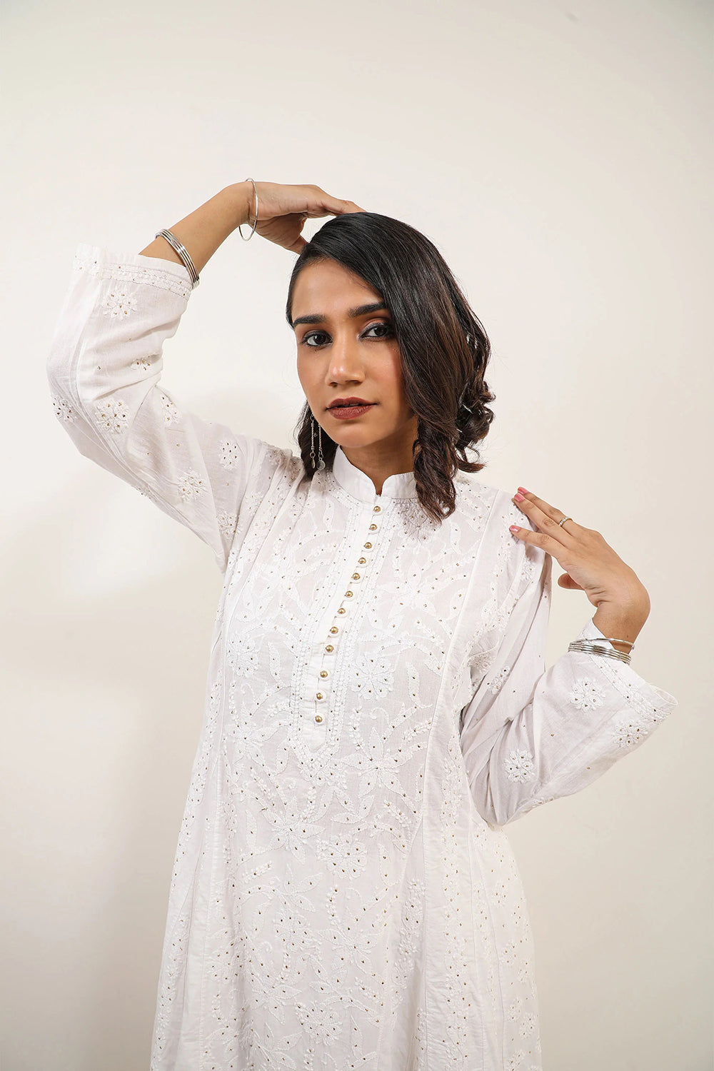 A perfect blend of gold and white - a gorgeous white kurta uplifted Chikankari work. The look is further completed with gold Mukaish detailing to help you win hearts. It is embraced in breathable Chanderi fabric and is featherweight, catering to all your aesthetics.