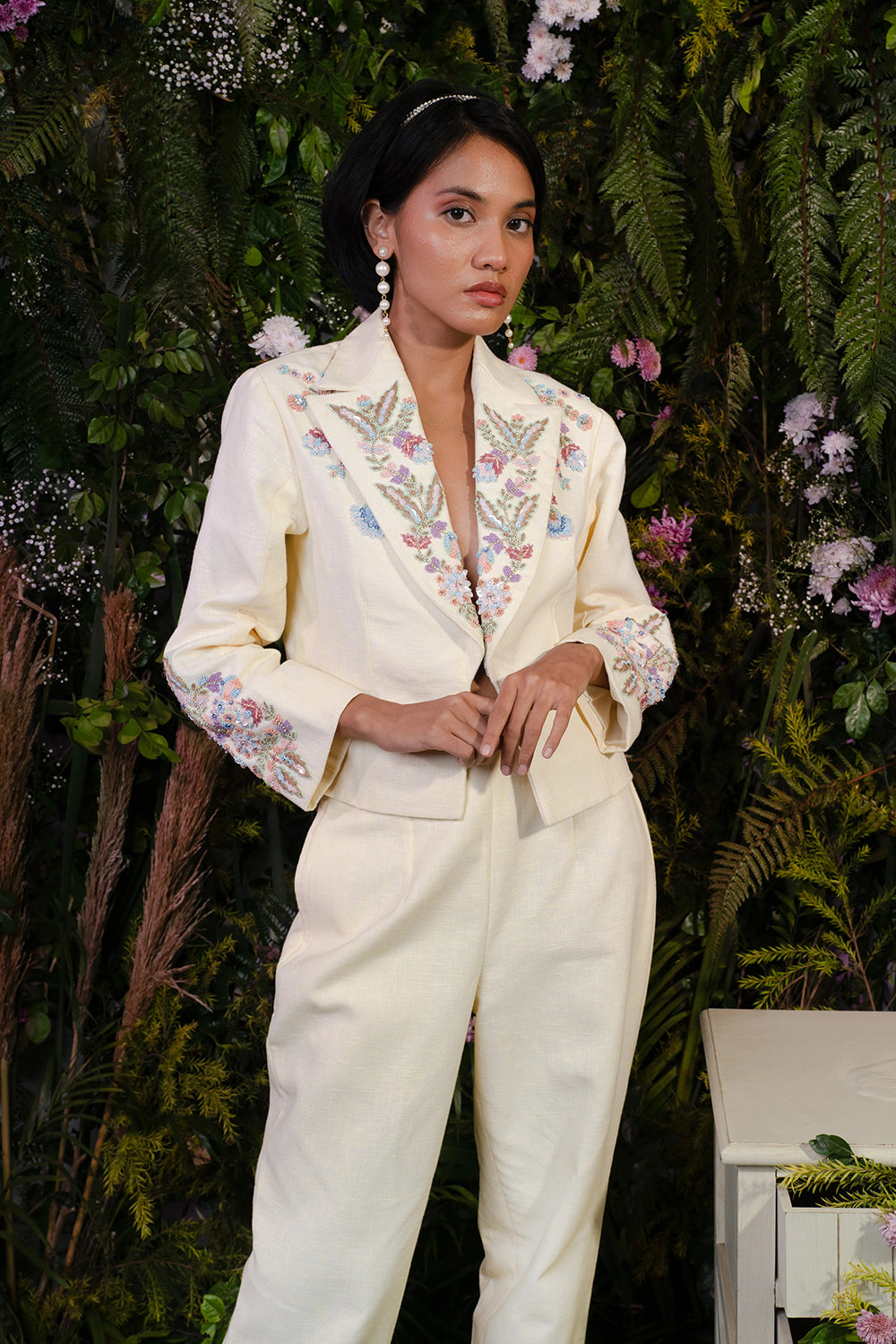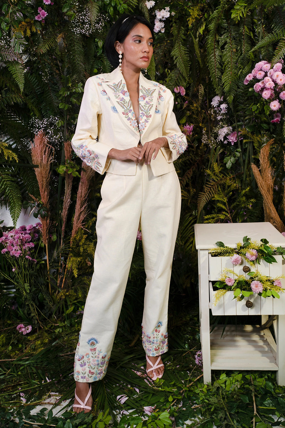 Lemon yellow co-ord set with floral embroidery on the short coat and ankle-length fitted pants.