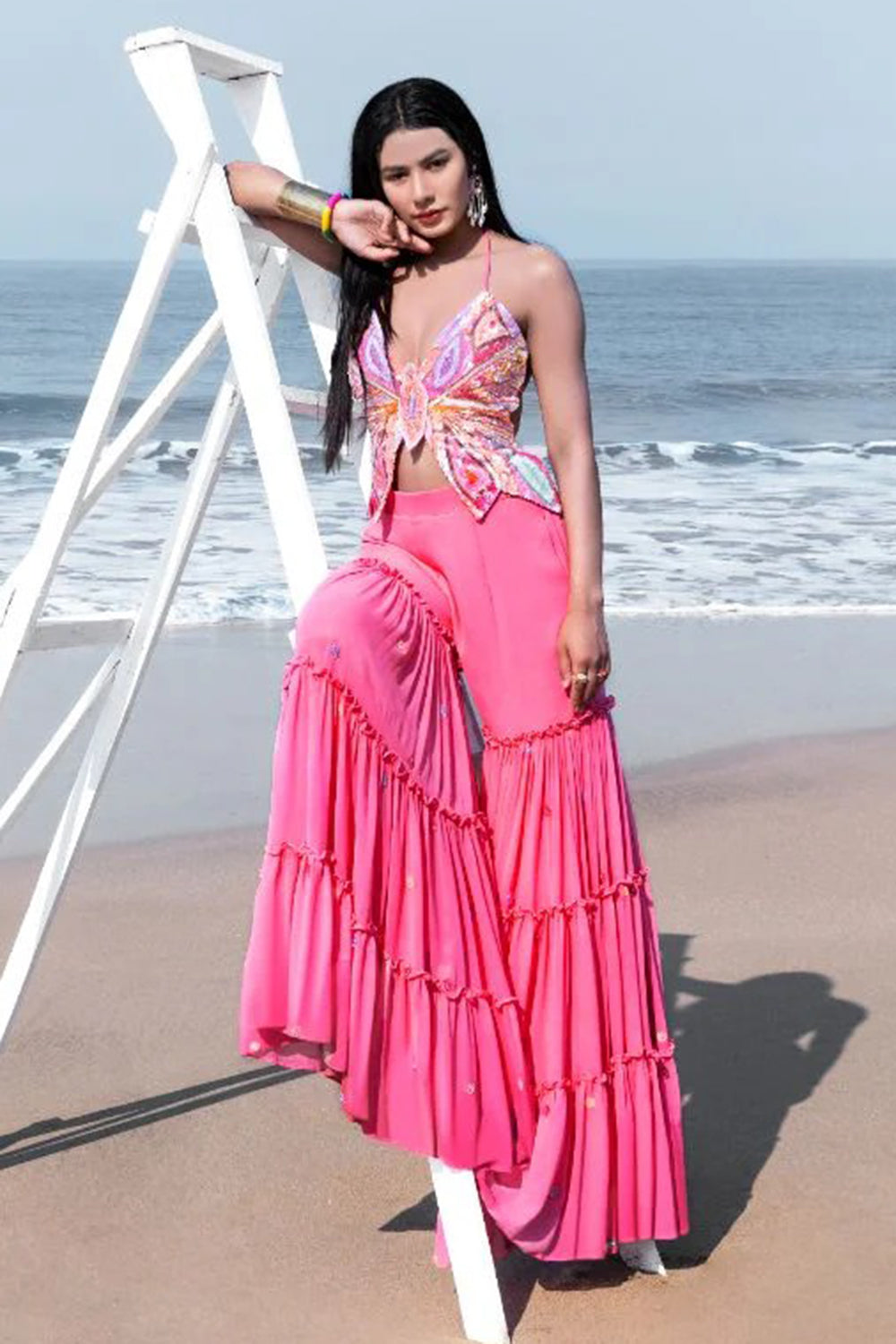 Our Butterfly Top and Hot Pink Sharara Pants ensemble from the Pitara collection will leave you mesmerized. The intricate embroidery, featuring delicate pearls, glistening sequins, and glass-cut beads arranged in charming flower motifs, adorns both the top and pants. The butterfly-inspired top and the vibrant hot pink sharara pants combine to create a delightful ensemble that perfectly captures the joy and radiance of summer weddings.