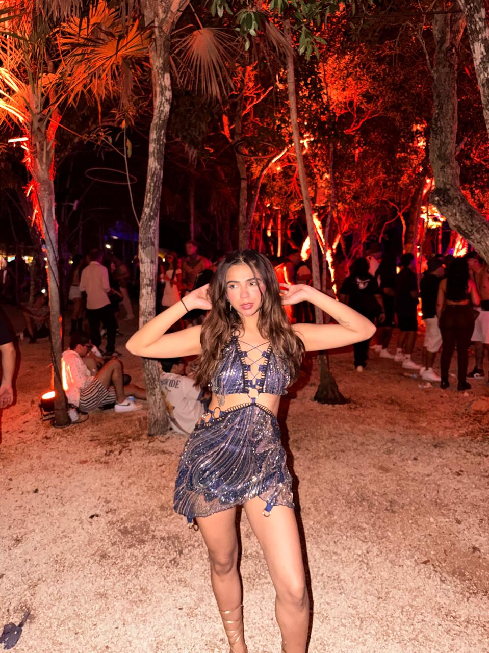 Crafted in a fully embroidered fabric, this electric blue mini dress is designed to stand out. The silhouette is structured yet playful, making it perfect for girls’ nights, concerts, and statement evenings.